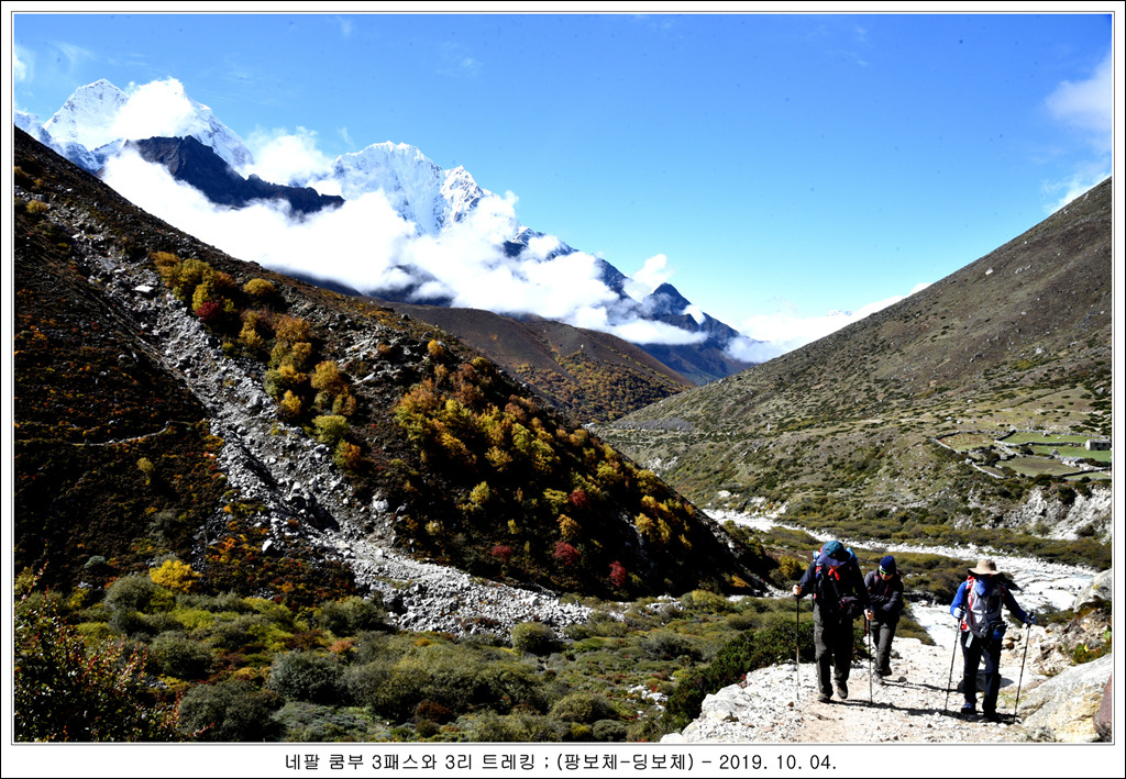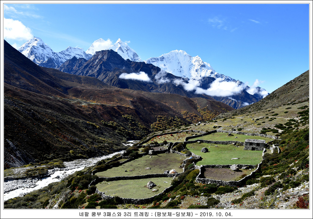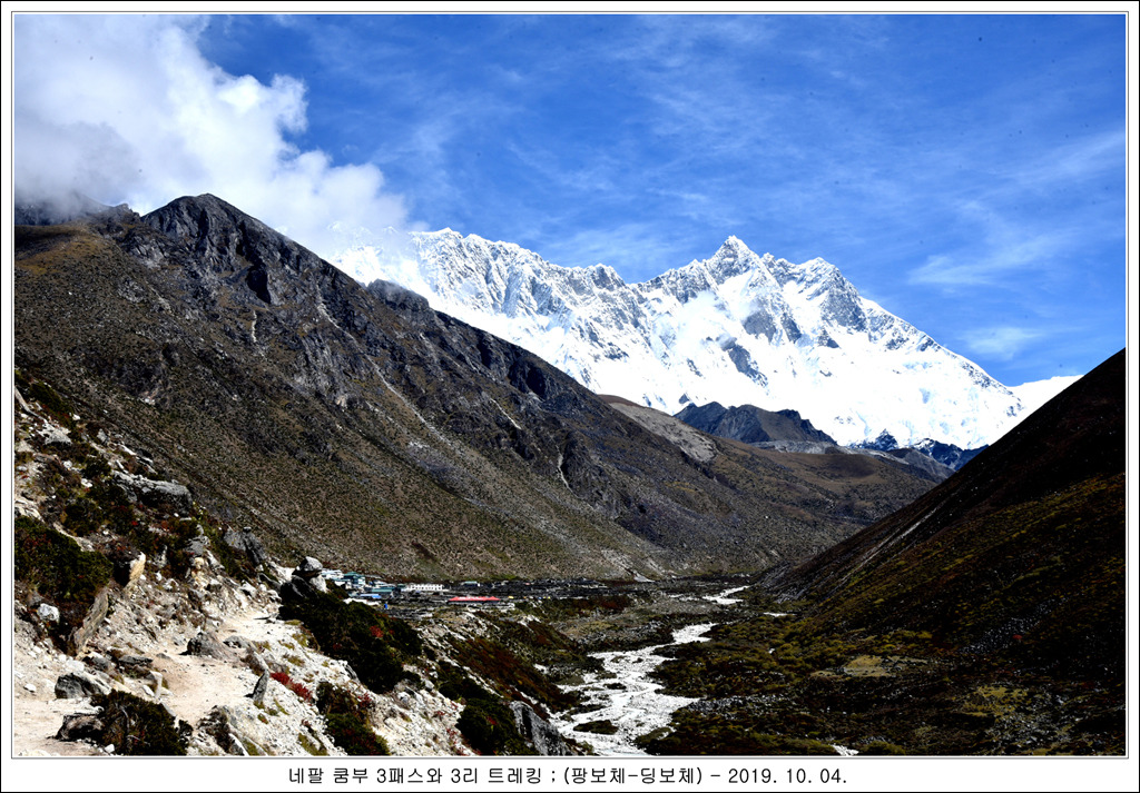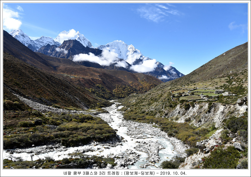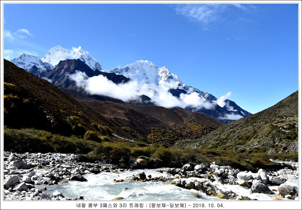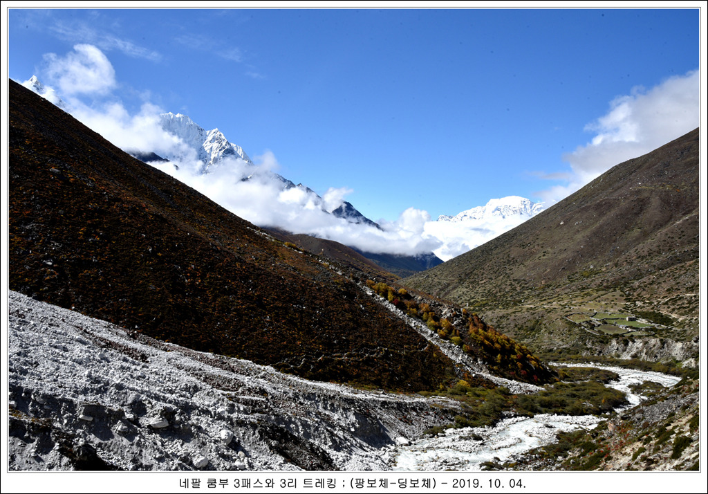 조금 더 가까이 왔습니다, 앞쪽 한참 더 가서 계곡을 건너 우측계곡을 따라 조금 올라가면 딩보체 입니다