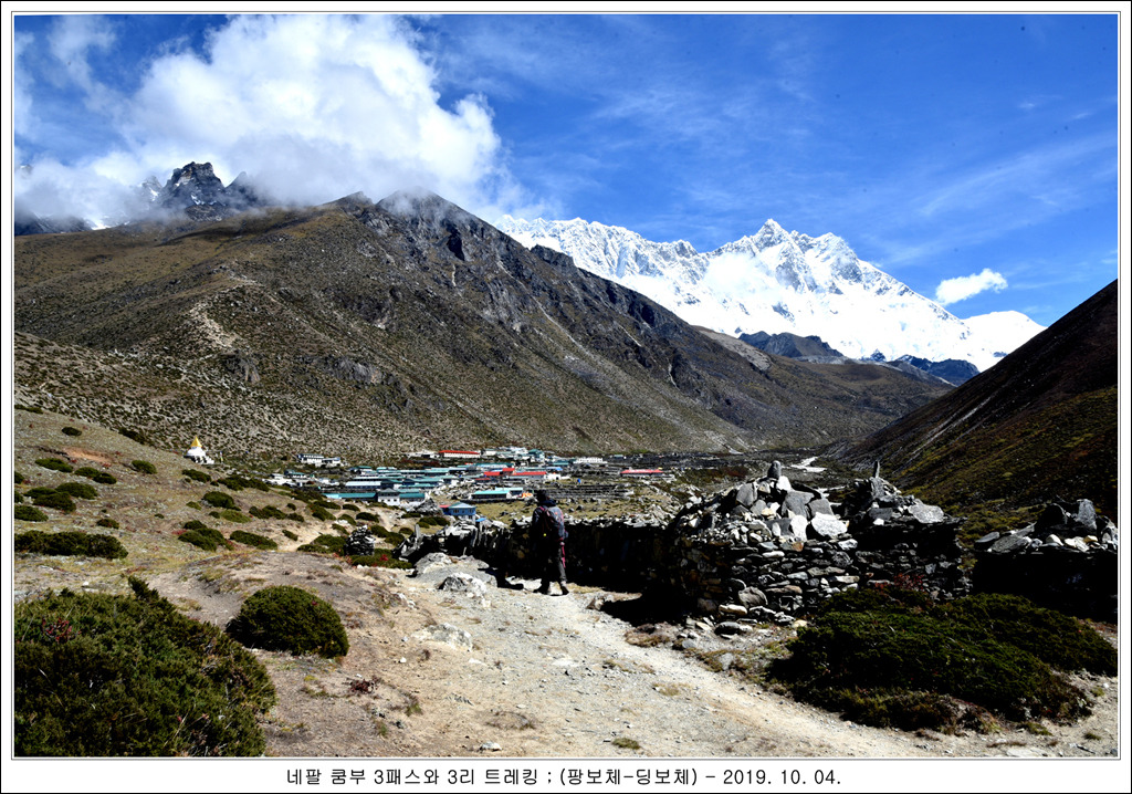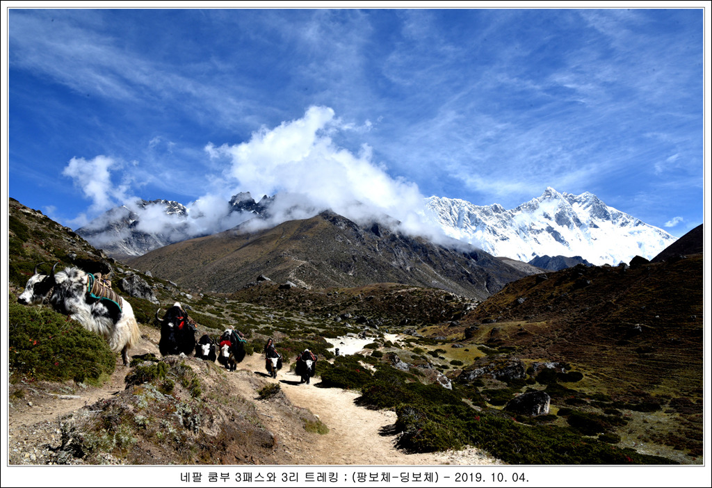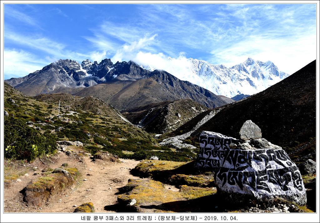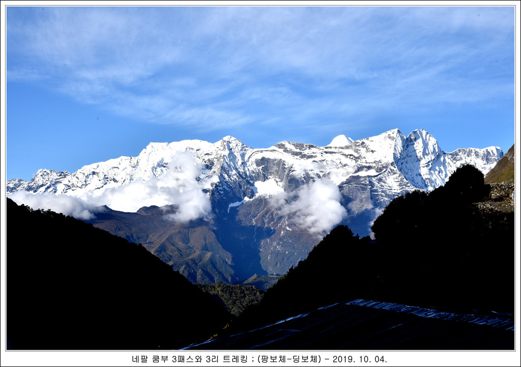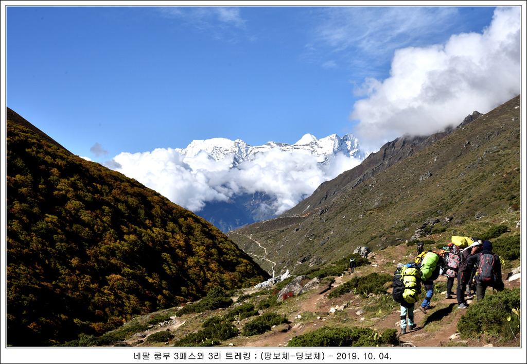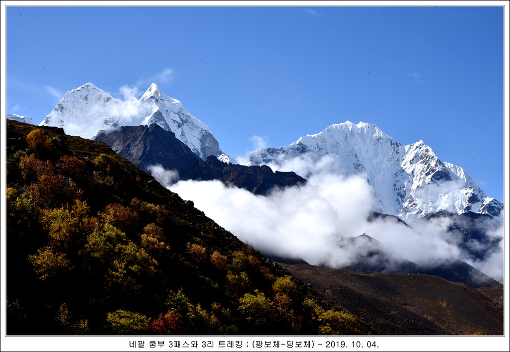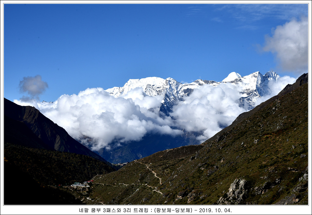 바로 넘어 딩보체인데 아직 보이지 않고 로체와 눕체가 가까이 보입니다, 구름에 가려있는 낭가르창 뷰포인트