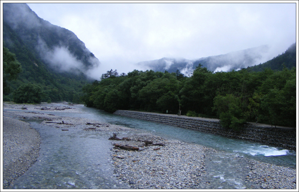 묘진 산장에서는 강을 건너서 가미고지로 내려갑니다, 다리에서 보는 건너편 길, 명신지 바로 옆입니다
