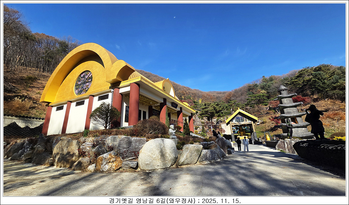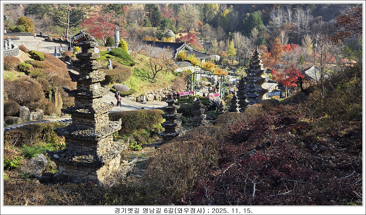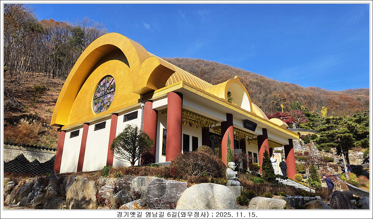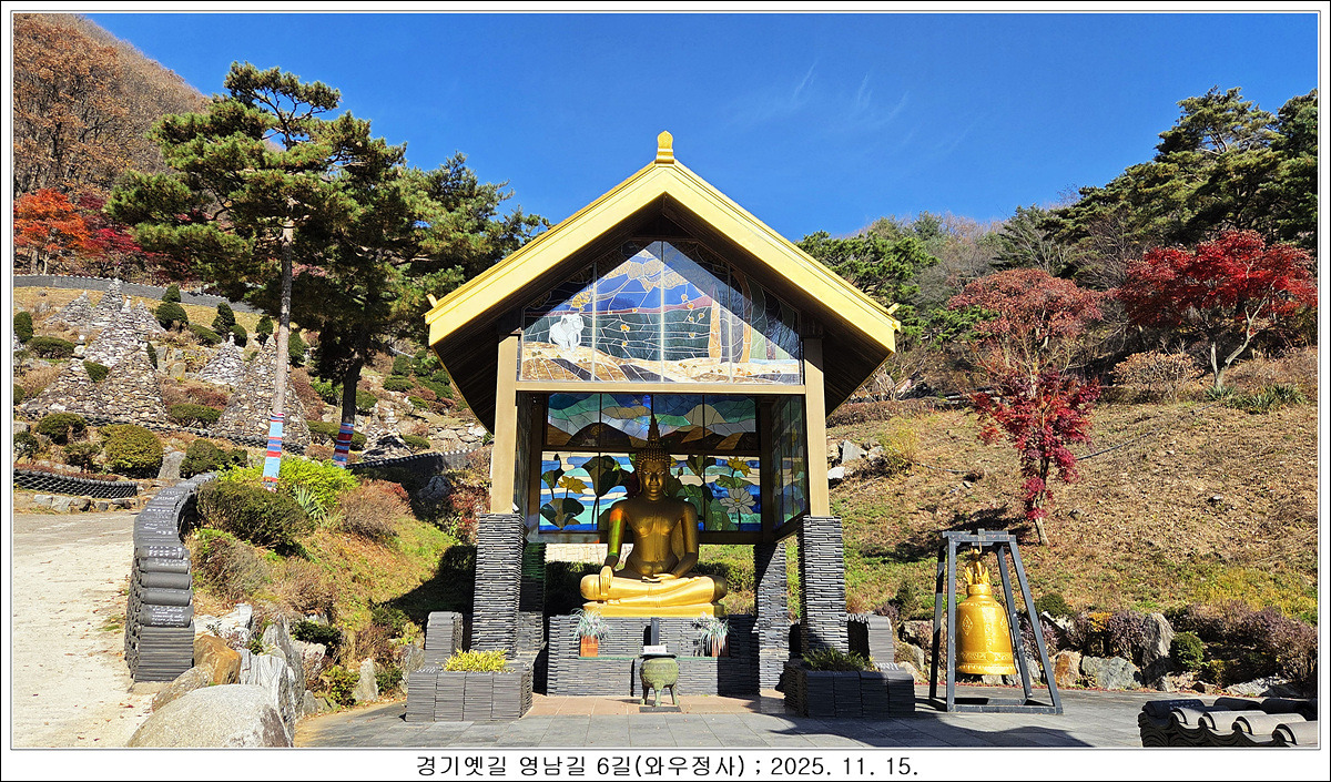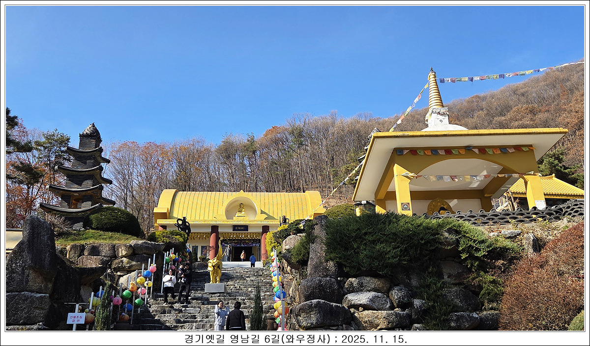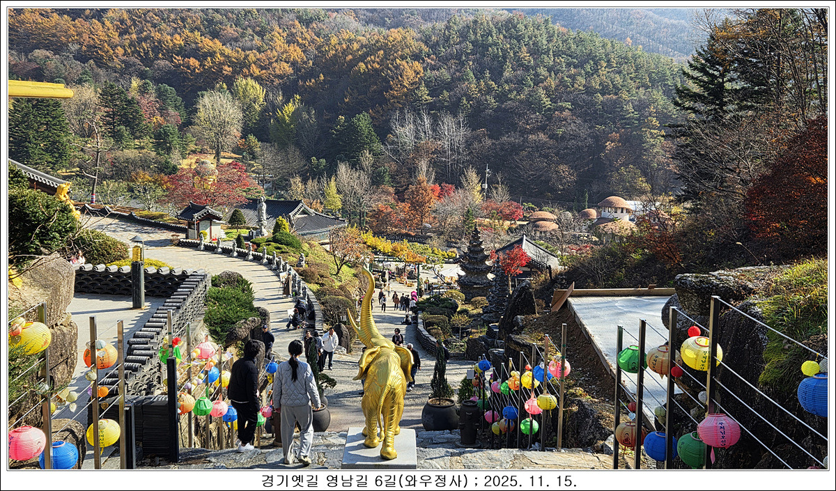 용인 와우정사와 농촌테마파크 ; 25. 11. 15. 작성자배낭여행|작성시간25.11.16|조회수24 목록 댓글 0 글자크기 작게가 글자크기 크게가 영남길 6코스를 걸으면서 와우정사와 농촌테마파크를 둘러보았습니다 와우정사 입구 근처에 아직도 단풍이 남아있군요 용인 농촌테마파크.. 다음검색 현재 게시글 추가 기능 열기 북마크 공유하기 신고 센터로 신고 댓글 댓글 0 댓글쓰기 답글쓰기 댓글 리스트