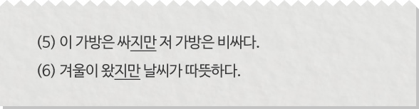 (5)에서 ‘-지만’은 앞뒤 절의 내용을 대조적으로 연결하는 것임이 분명하다. 그런데 (6)에서 ‘-지만’은 단순하게 생각하면 (5)의 ‘대조’ 의미와 별 다를 바 없어 보이나, ‘겨울’과 ‘날씨’를 대조하는 것이 아니라고 생각할 수도 있다. 이때의 ‘-지만’은 (2)에 쓰인 ‘-는데’와 같이 ‘양보’ 의미를 나타낸다고 볼 수 있다. 그래서 (5)는 대등하게 이어진 문장으로 보아 이때의 ‘-지만’은 대등적 연결 어미로, (6)은 종속적으로 이어진 문장으로 보아 이때의 ‘-지만’은 종속적 연결 어미로 보는 학자들이 많다. 사람들은 흔히 문법에서 단 한 가지의 고정적 해석을 원하곤 하는데, 문법 역시 여타 인문학과 마찬가지로 관점에 따라 달리 파악될 수 있는 현상들이 많다.