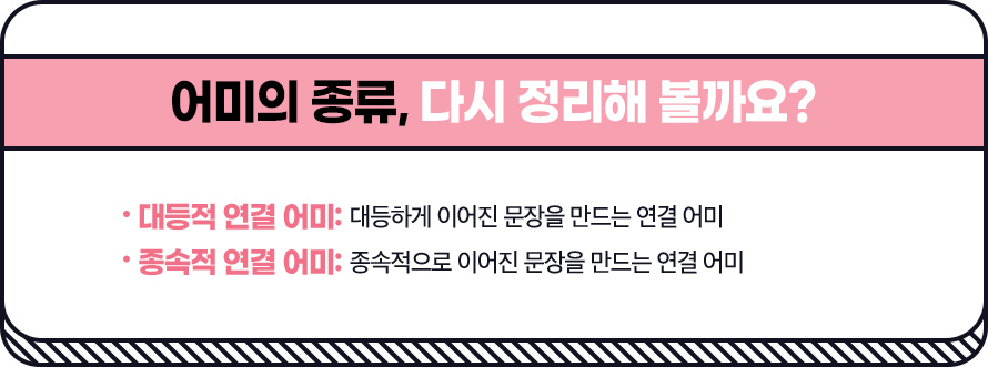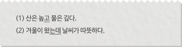 (1)은 ‘-고’로 연결된 대등하게 이어진 문장이다. 이처럼 대등하게 이어진 문장을 만드는 연결 어미를 ‘대등적 연결 어미’라고 한다. 대등적 연결 어미에는 ‘-고, -(으)나, -지만, -거나’ 등을 들 수 있다. 반면 (2)는 ‘-는데’로 연결된 종속적으로 이어진 문장이다. 이처럼 종속적으로 이어진 문장을 만드는 연결 어미를 ‘종속적 연결 어미’라고 한다.