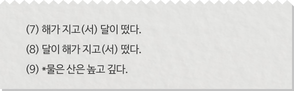 ‘-고’라고 해서 (1)과 같이 ‘나열’의 의미만 가지는 것이 아니다. (7)은 단순한 사실 나열이 아니라 해가 진 후에 달이 떴다는 시간적 선후 관계를 나타내는 문장으로 해석하는 것이 일반적 해석일 것인데, 이때의 ‘-고’는 (1)의 ‘-고’와는 달리 뒤에 ‘서’가 붙을 수 있다. 그리고 (8)과 같이 앞 절이 뒤 절 속으로 이동해 들어갈 수도 있다. 그러나 (9)에서 보듯이 (1)은 앞 절이 뒤 절 속으로 이동해 들어갈 수 없다. 앞 절이 뒤 절 속으로 이동해 들어갈 수 있는 것은 종속절의 특성 중 하나인데, 그래서 (7)의 ‘-고’는 (4)에서 보듯이 종속적 연결 어미로 분류가 되어 있는 것이다.