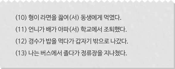 (10)에서는 ‘-어(서)’ 앞뒤 절이 시간적 선후 관계를 이루고 있으므로 이때의 ‘-어(서)’는 ‘앞선 시간’의 의미를 나타내지만, (11)에서는 ‘-아(서)’의 앞뒤 절이 인과 관계를 이루고 있어 ‘-아(서)’가 ‘이유/원인’의 의미를 나타낸다. 또 (12)에서의 ‘-다가’는 앞 절의 사건이 중단됨을 나타내지만 (13)의 ‘-다가’는 ‘이유/원인’의 의미를 나타낸다. 하나의 어미가 지니는 여러 의미는 서로 연관이 되어 있어 의미들을 분리하지 않고 하나의 본질적 의미로 설명하기도 하나, 일반적으로는 의미를 나누어 설명한다.