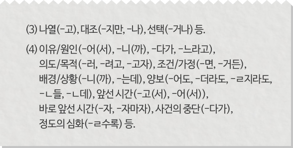 (3)은 대등적 연결 어미들이고 (4)는 종속적 연결 어미들이다. 이들을 구분하려면 의미적으로 두 절이 대등하게 이어져 있는지 종속적으로 이어져 있는지 구분해야 하는데, 절의 연결 방식을 판단하는 것이 쉬운 것만은 아니다.