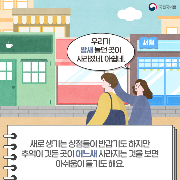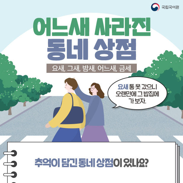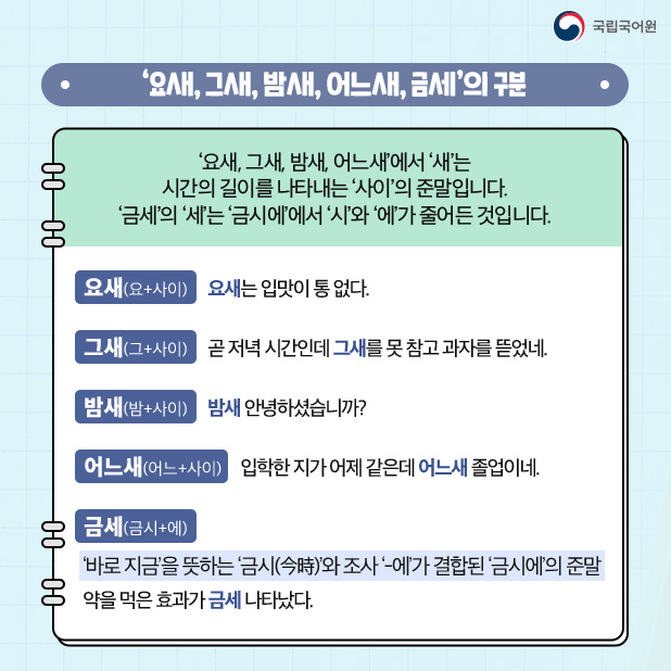 [단어장]실전 국어 표기법 - 요새, 그새, 밤새, 어느새, 금세 작성자이환준|작성시간21.03.05|조회수45 목록 댓글 0 글자크기 작게가 글자크기 크게가 실전 국어 표기법 다음검색 현재 게시글 추가 기능 열기 북마크 공유하기 신고 센터로 신고 댓글 댓글 0 댓글쓰기 답글쓰기 댓글 리스트