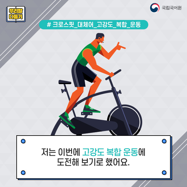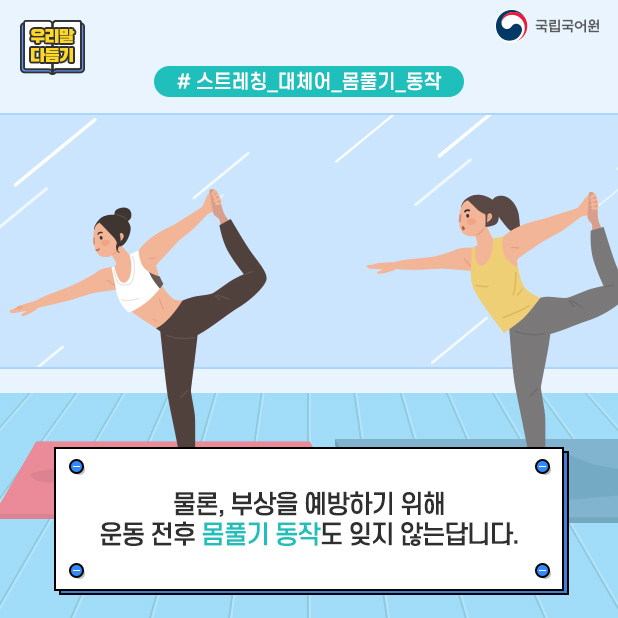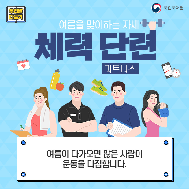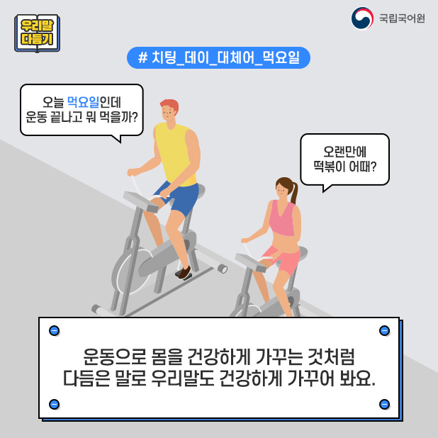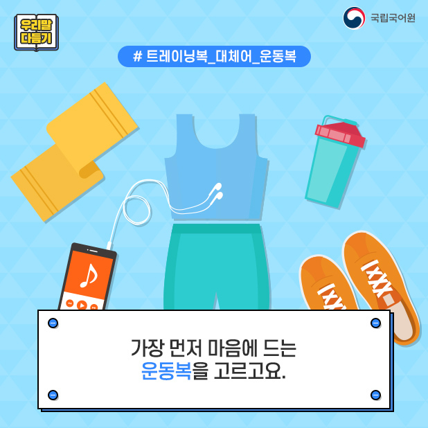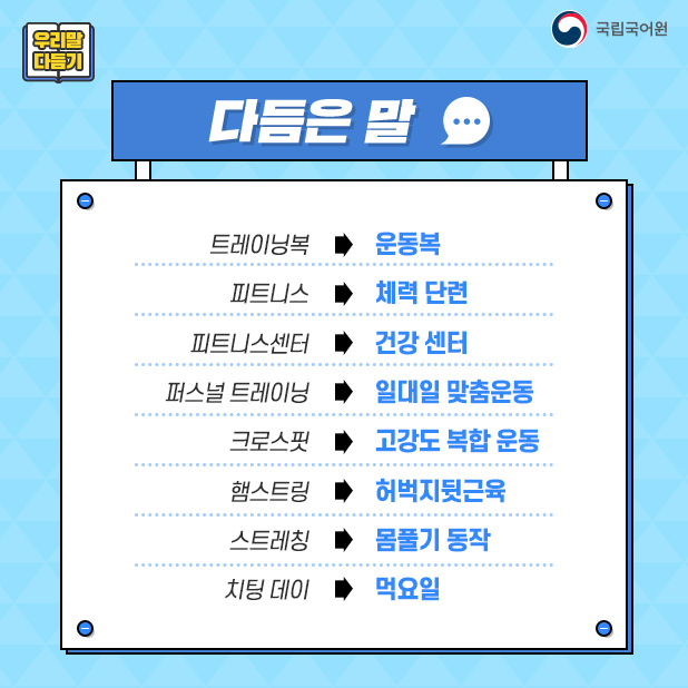 [우리말 다듬기]운동과 관련된 용어의 다듬은 말 작성자이환준|작성시간21.05.20|조회수461 목록 댓글 0 글자크기 작게가 글자크기 크게가 다음검색 현재 게시글 추가 기능 열기 북마크 공유하기 신고 센터로 신고 댓글 댓글 0 댓글쓰기 답글쓰기 댓글 리스트