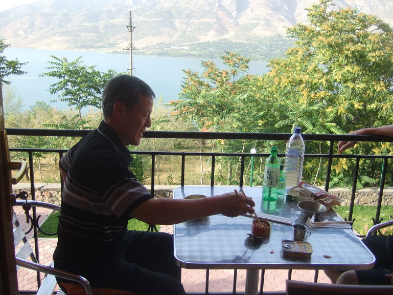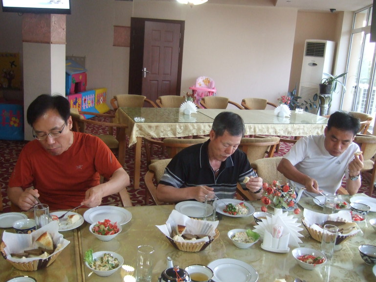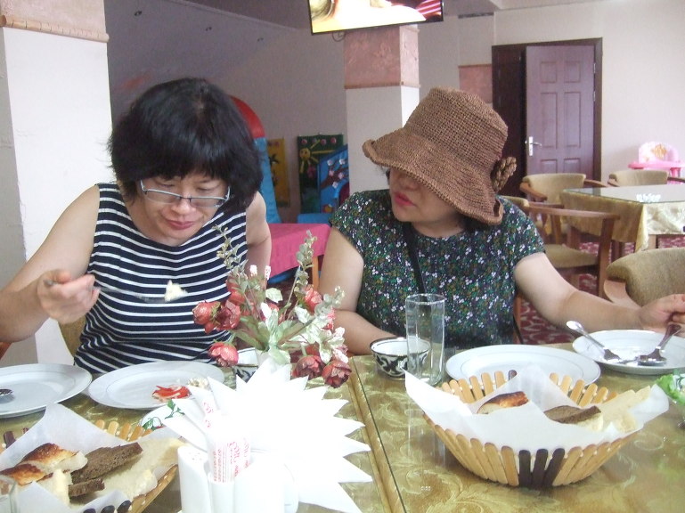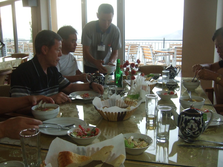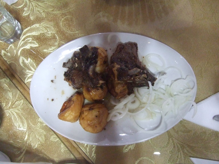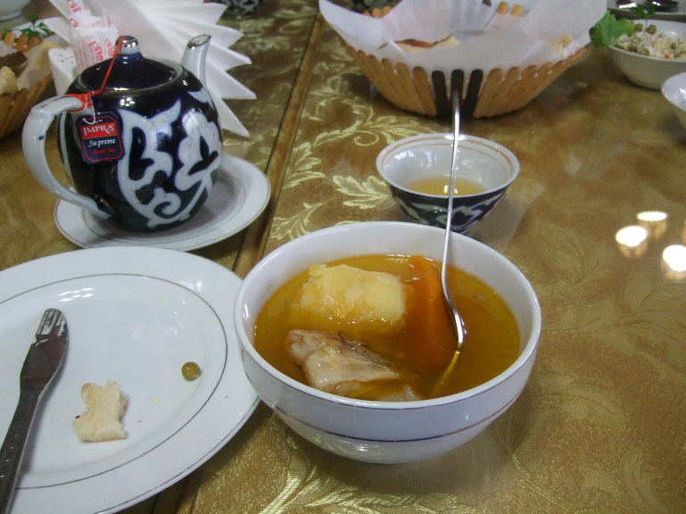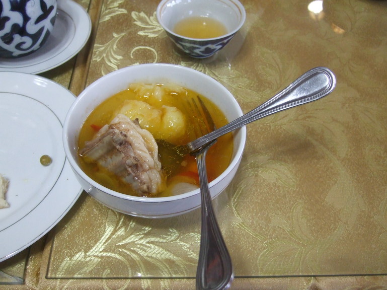 19:00 저녁식사로는 난(non, 논, 리뾰쉬카(лепёшка), 우즈베키스탄 전통 빵), 아측추축(achchiq chuchuk, 아츠추, 토마토-오이-양파 샐러드), 슈르빠(шурпа, 소고기 갈비탕), 까잔까봅(Козон кабоб, 양고기와 감자), 기타 등등이 나왔는데 향신료를 넣지 않아서 그런지 생각보다 담백하다.