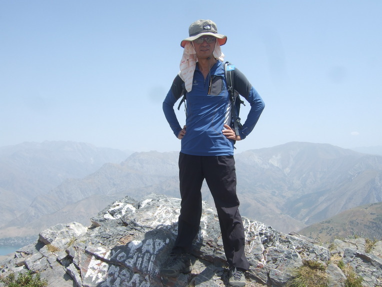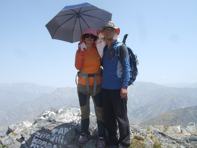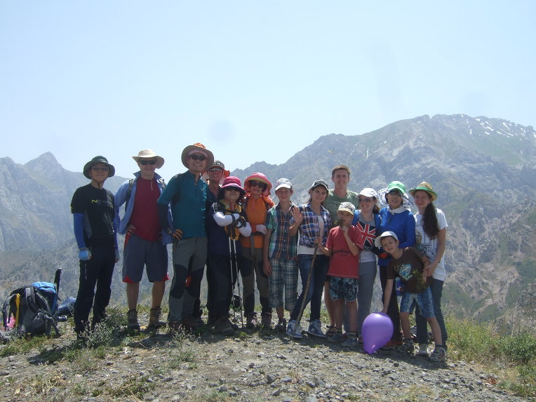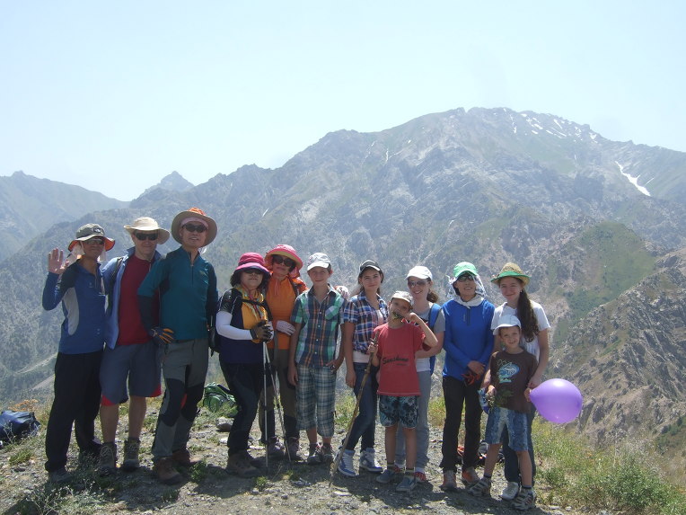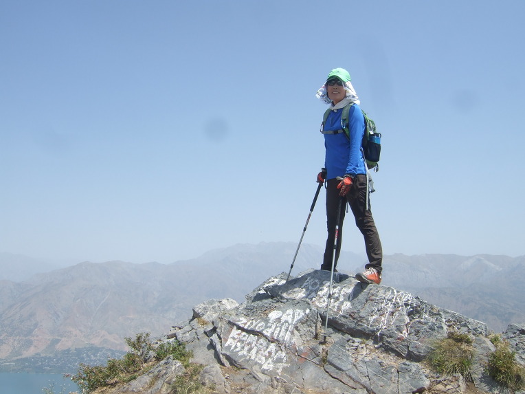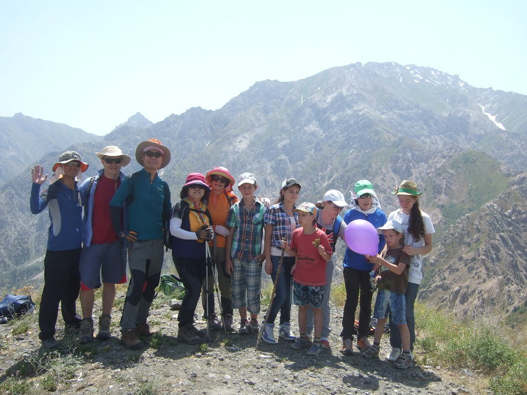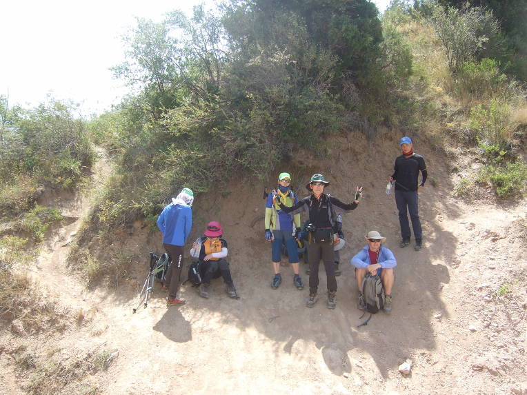 첫 봉우리에 올라서니 우크라이나 가족들이 반갑게 우리 일행을 맞이한다. 우크라이나에서 우즈베키스탄으로 가족 여행을 왔단다. 부모, 형제3, 자매2, 일곱 식구 대가족이다. 가벼운 차림으로 올라온 단순 관광객이다. 물을 원하므로 1.5리터 생수 한 병과 과자 두 봉지를 건네주자 자기들이 지금 이 순간 가장 원하는 것이 물이라면서 매우 고마워한다. 기념으로 단체사진을 찍고 헤어진다. 우크라이나 가족들은 하산하고, 우리는 등산하고.