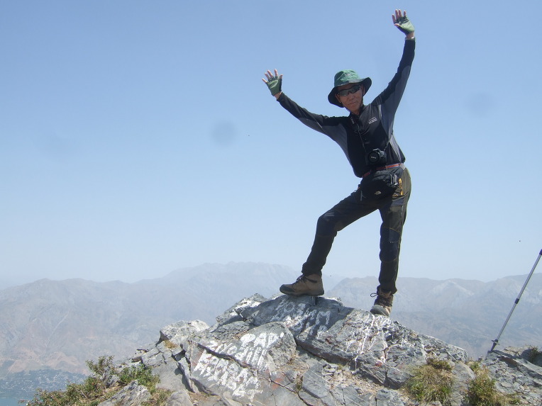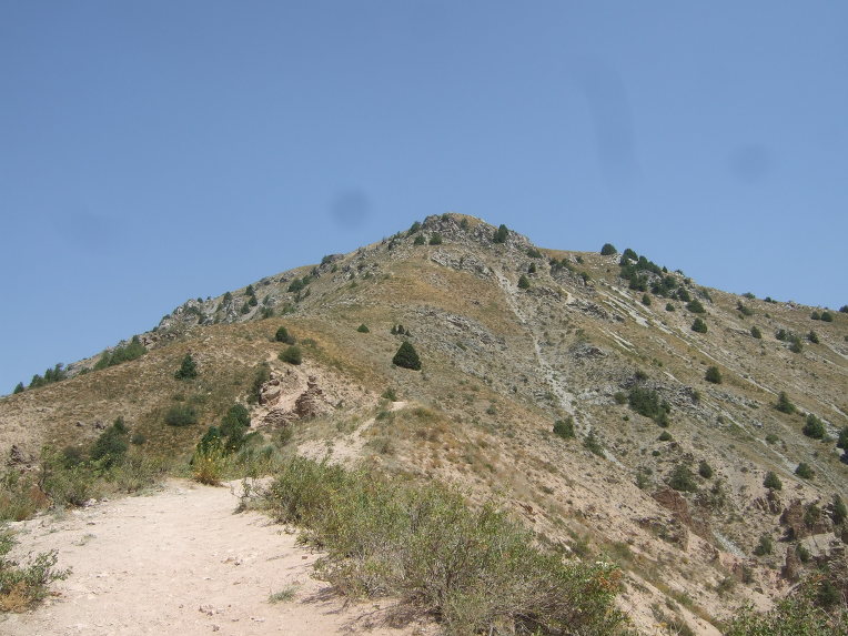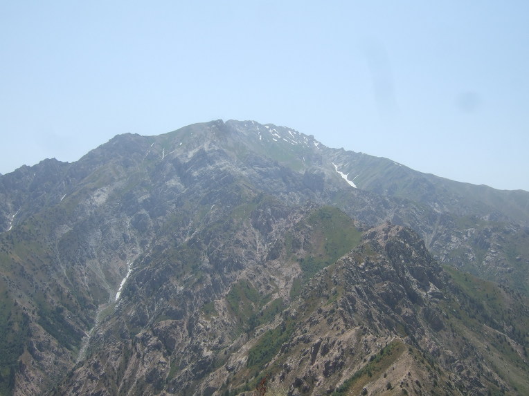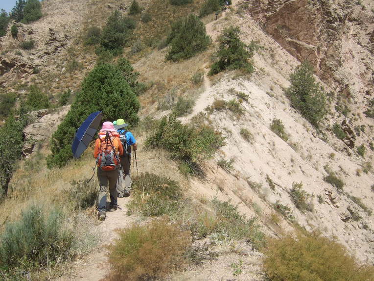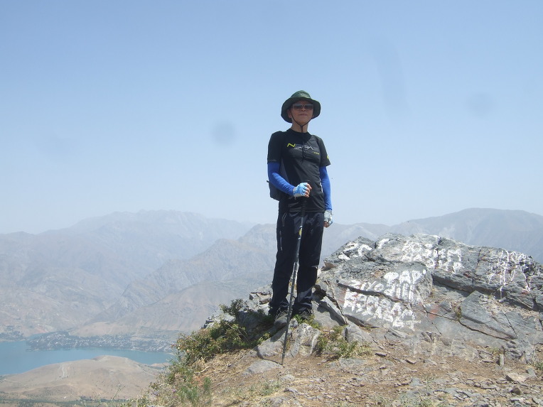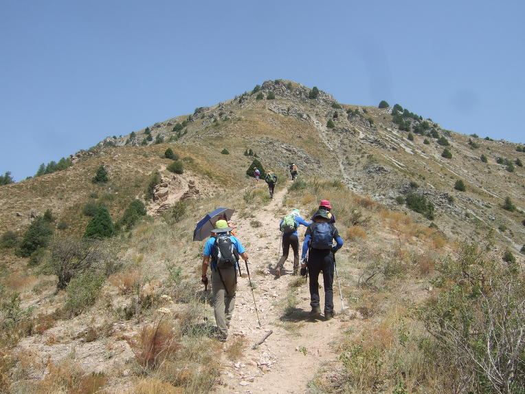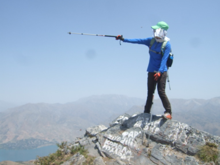 첫 봉우리에 올라서니 우크라이나 가족들이 반갑게 우리 일행을 맞이한다. 우크라이나에서 우즈베키스탄으로 가족 여행을 왔단다. 부모, 형제3, 자매2, 일곱 식구 대가족이다. 가벼운 차림으로 올라온 단순 관광객이다. 물을 원하므로 1.5리터 생수 한 병과 과자 두 봉지를 건네주자 자기들이 지금 이 순간 가장 원하는 것이 물이라면서 매우 고마워한다. 기념으로 단체사진을 찍고 헤어진다. 우크라이나 가족들은 하산하고, 우리는 등산하고.
