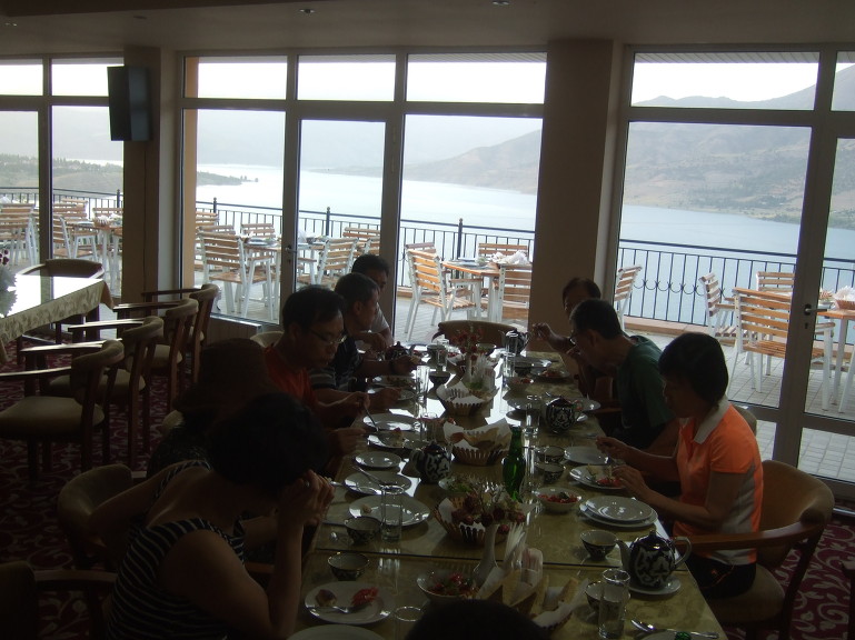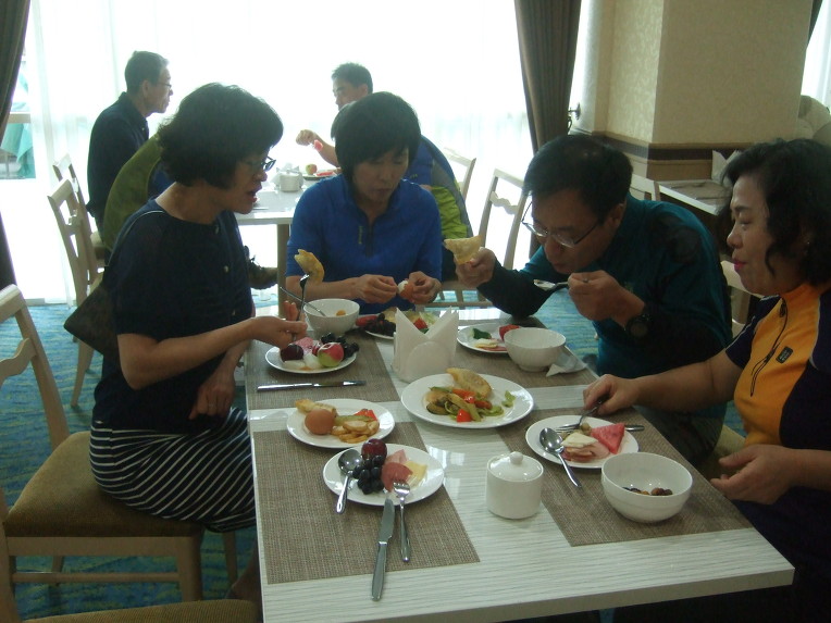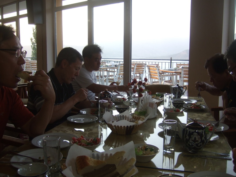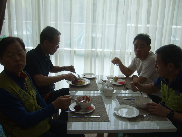06:30 뷔페식으로 차려진 아침 식사를 한다. 포도, 멜론, 수박, 사과, 자두, 건과류, 견과류가 많이 나온다. 사과는 아기 주먹 크기 정도이다. 여러 가지 종류의 포도와 멜론이 있는데, 당도가 높아 맛있다. 수박, 사과, 자두는 우리나라 것보다 못하다.
