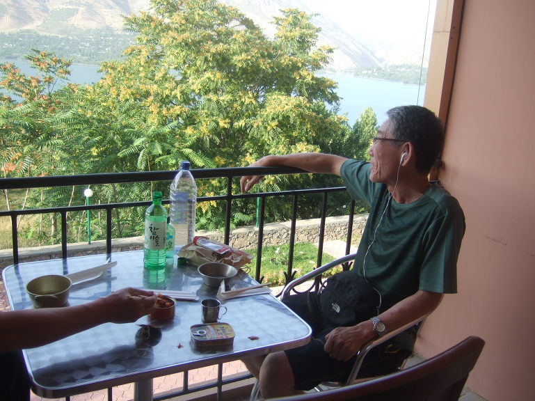 침간 마을에서 산악전문가이드(instructor)인 아르쫌(러시아인, 25세)을 만나서 산행에 대하여 간략하게 설명을 듣고 1.5리터 생수 한 병과 도시락을 지급받는다.