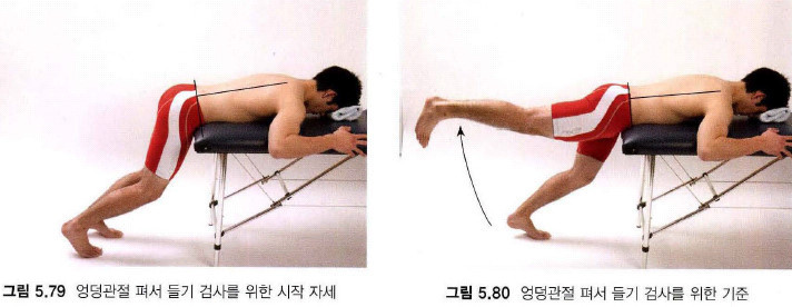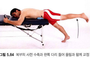 다음 그림은 엎드려서 고관절을 드는 동작입니다.