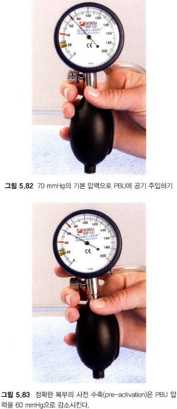 70mmhg로 공기 주입후 배꼽 밑에 넣고 편안히 사전수축의 자세를 취했을때 60mmhg 를 유지한 상태를 만든 상태가