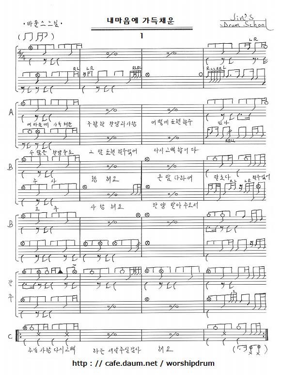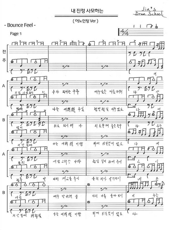 내 진정 사모하는 - 내 마음에 가득채운 ( 바운스리듬 ) 작성자진스드럼스쿨|작성시간09.03.03|조회수20,499 목록 댓글 90 글자크기 작게가 글자크기 크게가 ◎ 내 진정 사모하는 (어노인팅버젼) ◎ 바운스리듬은 간단히 말하면.. 비트의 조화가운데 일종의 흥미로운 흔들림(?)이라고 할 수 있는데요연주할때도 그렇고 듣는사람들도 기분좋게 어깨와 고개를 덩실덩실 흔들게 만들어 주는 리듬입니다. 아래 바운스 느낌 내는데 있어 3잇단 셔플 Feel 과 함께 익혀 나가면 도움됩니다! ◎ 내 마음에 가득채운 ◎ 다음검색 현재 게시글 추가 기능 열기 북마크 공유하기 신고 센터로 신고 댓글 댓글 90 댓글쓰기 답글쓰기 댓글 리스트 작성자아기자기2 | 작성시간 16.02.23 이정도만이라도 치고 싶네용 작성자eunice | 작성시간 16.08.08 오~ 너무 신나고 좋네요^^ 저도 얼른 저렇게 칠 수 있었으면 좋겠습니다 ㅎ 작성자씨다바리 | 작성시간 17.08.24 내 마음에 가득채운 드럼악보는 없어졌나요?다시 복사하려고 했는데 없네요 답댓글 작성자진선생 작성자 본인 여부 작성자 | 작성시간 17.08.26 다시 올려드렸습니다 ^^ 작성자시대의 파숫군 | 작성시간 17.09.17 감사합니다 댓글 전체보기