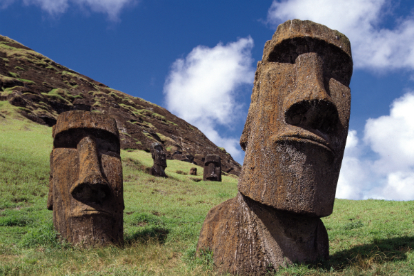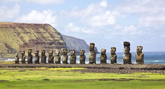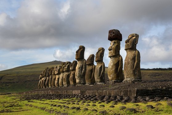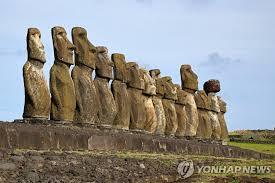모아이석상. 칠레의 西쪽바다.이스터섬 絶海孤島의 석상 900여개가 바다를 등지고 서 있다.큰 것은 90톤이나 된다 세계7대
