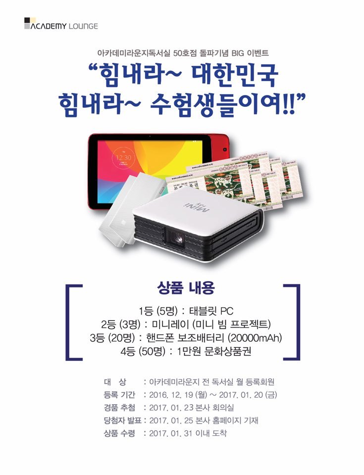 당첨자 발표 : 2017년 1월 25일(수) 본사 홈페이지 기재(http://academylounge.co.kr/)