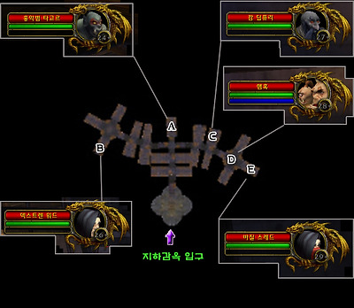 각 알파벳이 표시된 곳에는 좀 더 강한 보스급 몬스터들이 존재하며, 기본적으로 지하 감옥의 모든 몬스터들은 체력이 감소하면 도망가게 되고 동료 몬스터들을 데려 온다.