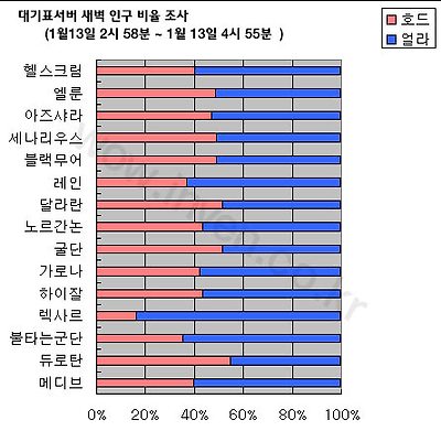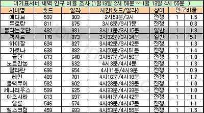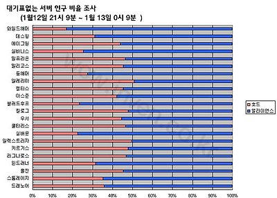 와우는 호드와 얼라이언스 두 진영의 대립과 반목의 이야기들이 중심이 된다. 어느 진영의 일원이 되느냐에 따라 게임의 환경은 많이 다르게 주어지며 게임을 중요한 요소 중에는 전쟁과 일반서버의 구분 그리고 각 진영의 인구비율을 꼽을 수 있다. 서버의 구분이야 본인이 직접 선택하면 되지만 인구비율은 조사된 데이터가 아니면 확실하게 파악할 수 없는 부분이다. 따라서 많은 이들이 서버별 인구비율에 대해 많은 관심을 가지고 있는데.. 이에 지난 12일 저녁부터 13일 새벽동안 와우의 애드온 중 하나인 인구조사 기능을 통해 최근의 인구비율을 조사해봤다. ■ 인구조사 시간대 - 본 데이터는 1월 12일 저녁부터 ~ 13일 새벽까지 수집된 데이터입니다. - 대기표로 인해 대기표가 없는 서버의 경우 21시 9분부터 ~ 0시 9분까지 진행하였습니다. - 대기표로 인해 인구초과서버의 경우 새벽시간대인 2시 58분부터 ~ 4시 55분까지 진행하였습니다. ■ 인구비율 조사 - 본 인구비율 조사는 각 서버의 정확한 전체 인구수를 파악하는 목적의 데이터가 아닌 - 대략적인 인구비율을 파악하기 위한 목적으로 조사된 데이터임을 알립니다. - 애드온, 인구조사 기능의 조사방식상 일정의 오차를 포함하고 있고 실시간 서버이전과 - 특정조사시간대 인구조사라는 변수를 포함하고 있으므로 실데이터와 차이가 있음을 알립니다. ■ 대기표가 없는 서버 인구비율조사 (1월 12일 21시 9분 ~ 1월 13일 0시 9분) ![]() - 서버순서는 임의 선정하였으며 리스트는 조사시간대를 기준으로 정리하였습니다. - 조사시간은 서버별로 약간 격차가 있으며 인구비율은 호드진영을 1로 기준하였습니다. - 조사과정에서 와일드해머서버가 누락되어 새벽 5시에 추가하였습니다. - 조사과정에서 이오나서버가 누락되어 14시에 추가하였습니다. ■ 대기표 서버 인구비율조사 (1월 12일 21시 9분 ~ 1월 13일 0시 9분) ![]() - 서버순서는 임의 선정하였으며 리스트는 조사시간대를 기준으로 정리하엿습니다. - 부득이하게 대기표가 없는 새벽시간을 통해 조사하였기때문에 실 데이터와는 - 다소 차이가 있을 수 있으며 인구비율은 호드진영을 1로 기준하였습니다. - 현재 진행중인 실시간 서버이전에 영향을 받는 데이터라 할 수 있습니다. ■ 인구 비율 차트 비교 ![]() ![]() ■ 조사과정 이야기 최초의 조사는 흔히 말하는 피크시간대에 발생하는 '대기자 현상'으로 인해 드래노어 서버에 정착하게 되며 듀로타 공개채널에서 제기된 "인구비율"에 대한 토론에서 시작되었다. 기존에 알려진바에 의하면 드래노어 서버의 인구비는 1대 5 혹은 그 이상이다. 라는 의견이 지배적이여서 이를 어느정도 확인해볼 필요성을 느꼈고 그렇게 시작된 조사가 이왕이면 전 서버를 모두 조사하는 것이 이러한 궁금증을 가진분들에게약간이나마 도움이 될 것이라 생각했다. 물론 위에서 언급한대로 100% 실 데이터는 아니지만 말이다. 조사과정에서 전 서버에 두드러진 현상으로는 1. 만 레벨 유저 포화 ![]() 2. 도적, 전사 직업 초강세 / 드루,성기사, 마법사 약세 ![]() 3. 호드 언데드 - 타우렌 - 오크 트롤 순으로 선호로 조사됨 4. 얼라이언스 인간 - 나엘 - 노움 - 드워프 순으로 선호로 조사됨 ![]() 이미 알려진대로 대부분의 서버는 호드에 비해 얼라이언스가 강세를 이루고 있다. 이는 데이터상의 오류를 감안해도 큰 폭의 차이는 없음을 알 수 있다. 서두에서 언급한 것처럼 호드와 얼라이언스의 대립이 게임진행에 여러가지 요소에 영향을 주는 만큼 양진영간 인구불균형 현상은 효율적으로 맞춰나갈 수 있는 대안들이 필요해 보인다. 확작팩에서 등장하는 블러드엘프의 등장으로 호드 진영으로 대거 이주가 예상되긴하지만 확장팩 일정은 아직 미공개로 인구불균형에 대한 갈증을 해소하기에는 아직 부족한 편이다. 드래노어 서버, ZeNY |