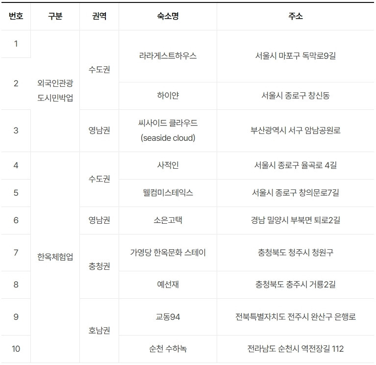 이번 선정은 외국인 관광객이 이용하는 외국인관광도시민박업 부문과 한국 전통 건축미를 체험할 수 있는 한옥체험업 부문으로 나뉘어 진행됐다. 외국인관광도시민박업 분야에서는 서울 종로구 동대문 일대를 내려다보는 위치에 자리한 ‘하이얀’과 부산 서구에서 객실 안에서 바다를 조망할 수 있는 ‘씨사이드 클라우드’를 포함한 3곳이 선정됐다.