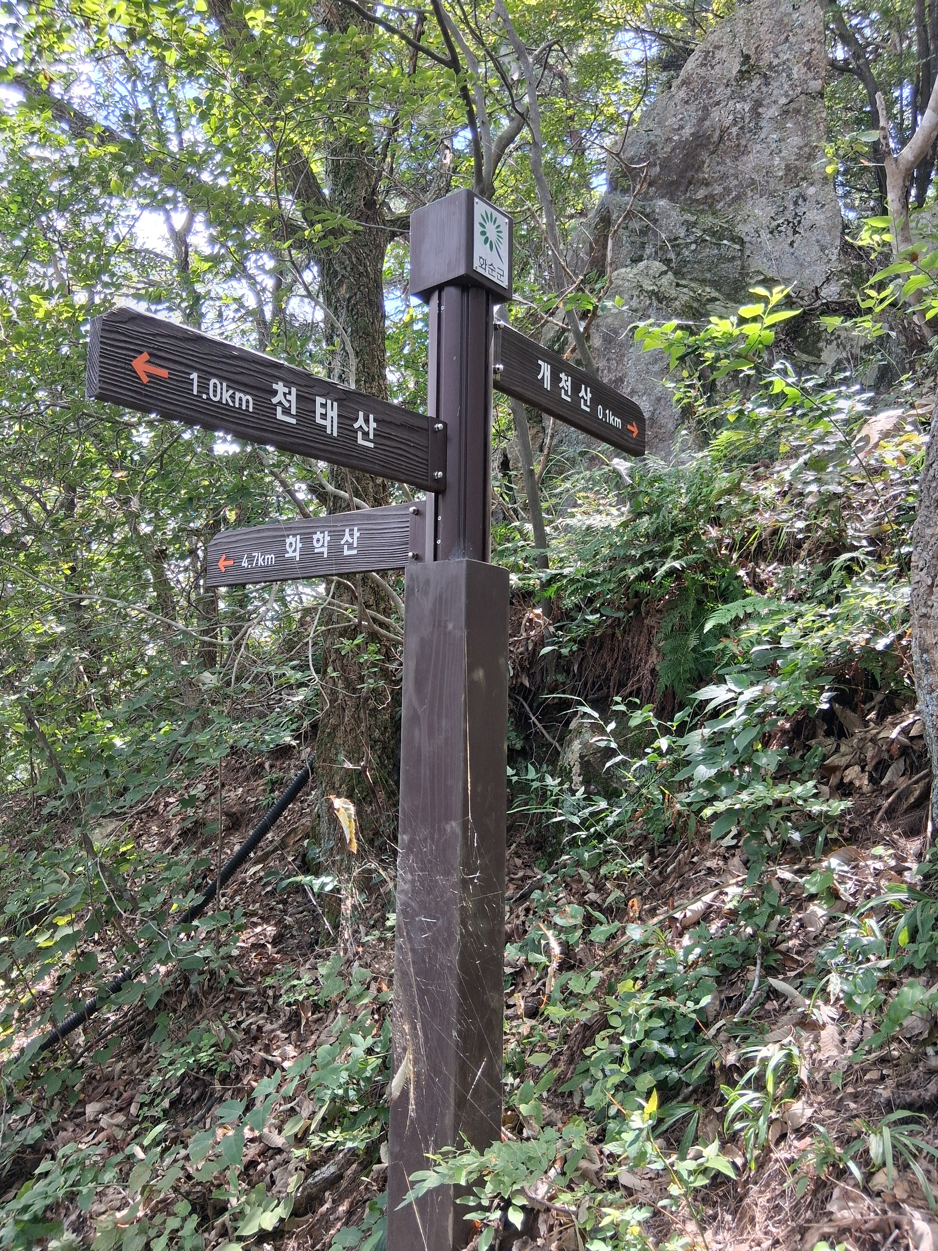 산행코스;주차장-개천사-거북바위-홍굴재(우측)-헬기장-기암-천태산(백)-홍굴재-화학산(갈림길)-철계단-개천산(백)-