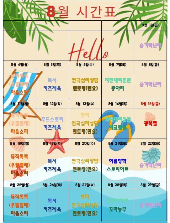 8월 시간표 작성자지니쌤|작성시간25.08.05|조회수27 목록 댓글 0 글자크기 작게가 글자크기 크게가 다음검색 현재 게시글 추가 기능 열기 북마크 공유하기 신고 센터로 신고 댓글 댓글 0 댓글쓰기 답글쓰기 댓글 리스트