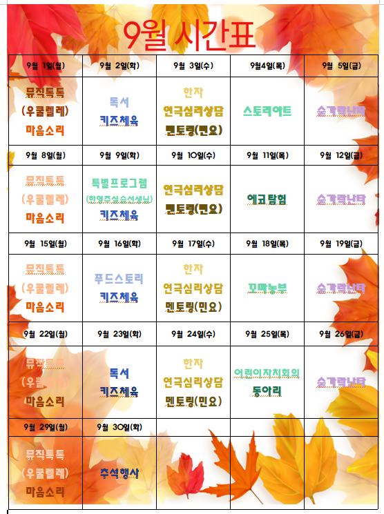9월 시간표 작성자지니쌤|작성시간25.09.01|조회수13 목록 댓글 0 글자크기 작게가 글자크기 크게가 다음검색 현재 게시글 추가 기능 열기 북마크 공유하기 신고 센터로 신고 댓글 댓글 0 댓글쓰기 답글쓰기 댓글 리스트
