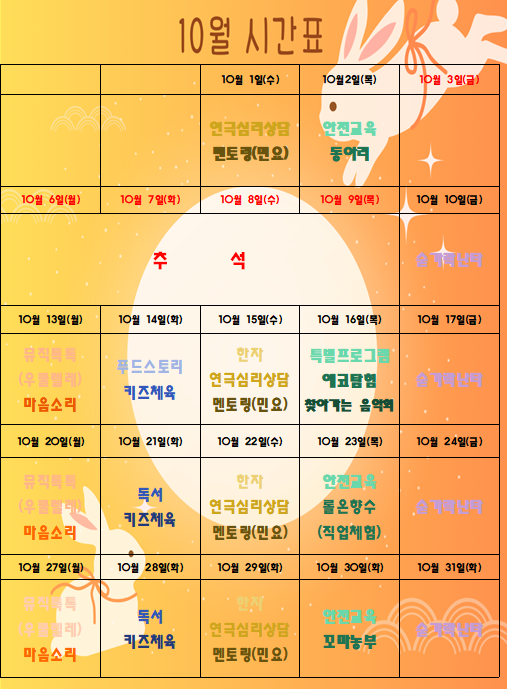 10월 시간표 작성자지니쌤|작성시간25.10.15|조회수8 목록 댓글 0 글자크기 작게가 글자크기 크게가 다음검색 현재 게시글 추가 기능 열기 북마크 공유하기 신고 센터로 신고 댓글 댓글 0 댓글쓰기 답글쓰기 댓글 리스트