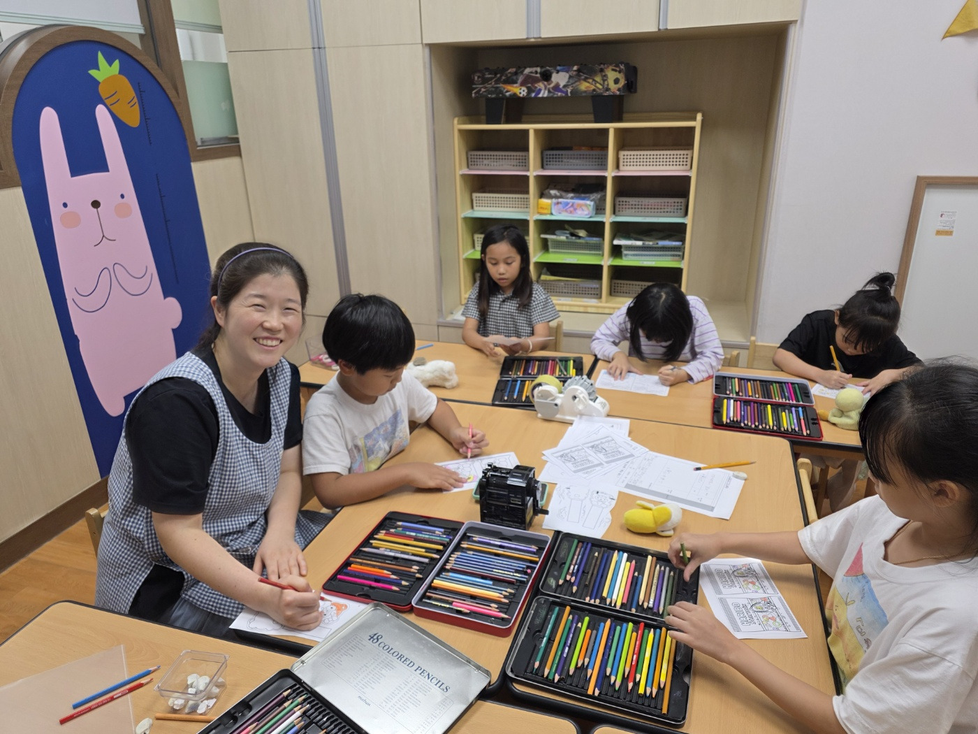 미술 동아리 '종이 스퀴시 만들기' 활동 모습(해맑게 웃으시며 아이들과 함께 활동하는 실습 선생님)