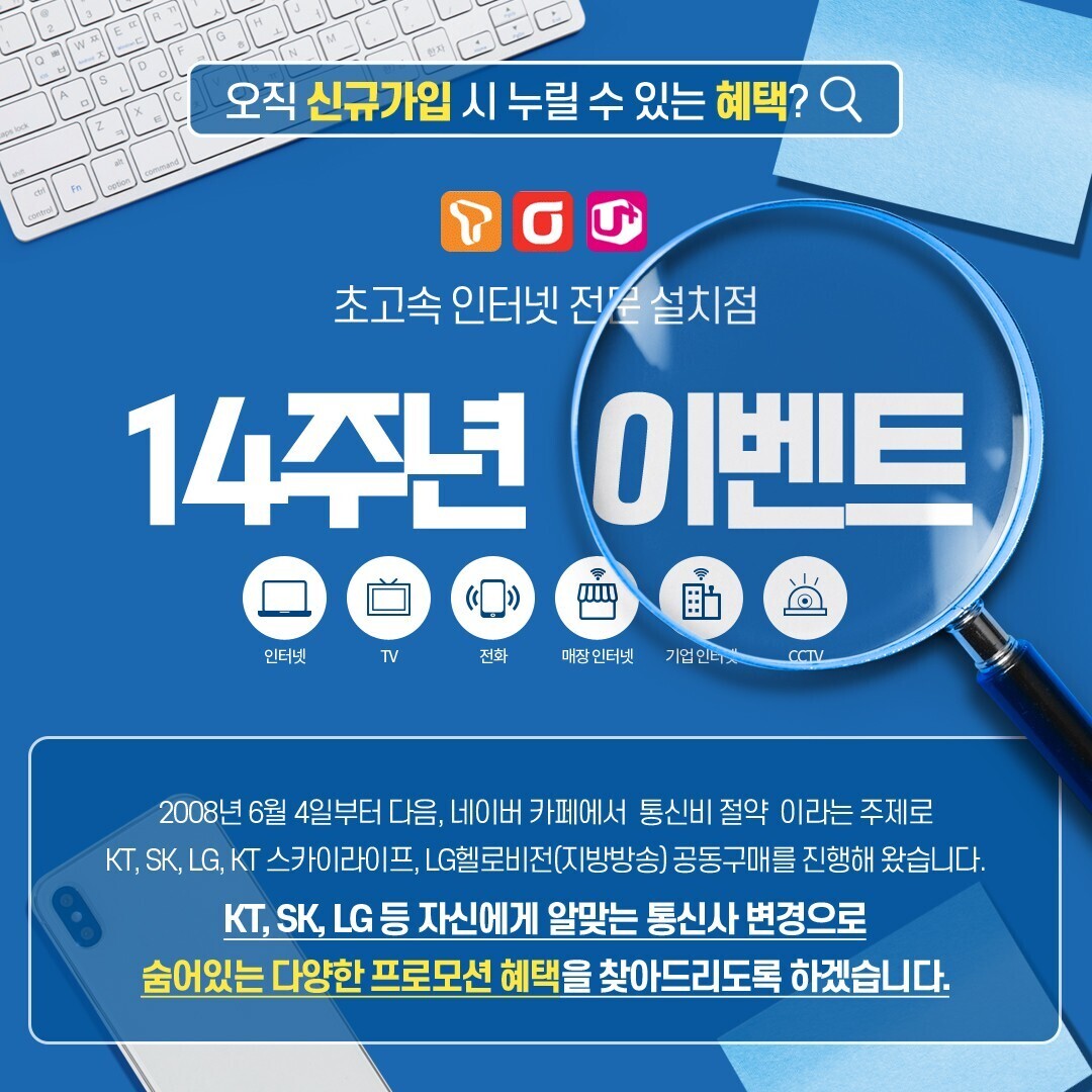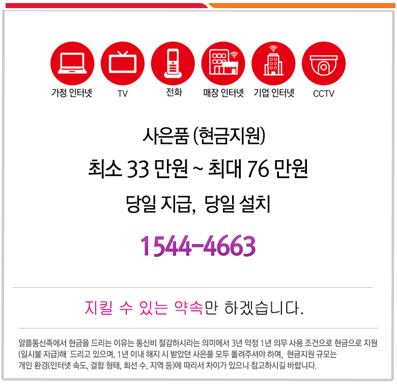 위 또는 아래 SK, LG. KT 등 인터넷 신규 설치 시 받을 수 있는 다양한 프로모션을 진행하고 있으며, 현금 지원 또한 넉넉하게 해드리고 있습니다. 치열하게 경쟁하니 아래 전화 주시면 몇 가지 질문 후, 세세하게 설명해드리겠습니다.