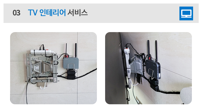 그러나, TV 인테리어 측면에서 보다 깔끔한 설치를 희망하면, TV 인테리어 서비스를 별도로 요청해야 위 사진과 같은 서비스를 받아 볼 수 있습니다. 절차는 설치 전후, 별도로 요청하시면 TV 인터 테리어 서비스 전문 설치에 한 번 더 방문하여 위와 같이 깔끔하게 서비스 받아 볼 수 있습니다. 비용은 TV 크기, 무나 공 유무, 거치대 유무, 지역에 따라서 달라지며, 위 금액은 일부 대리점에서 현금 지원받아 설치도 가능하니 참고하시길 바랍니다.