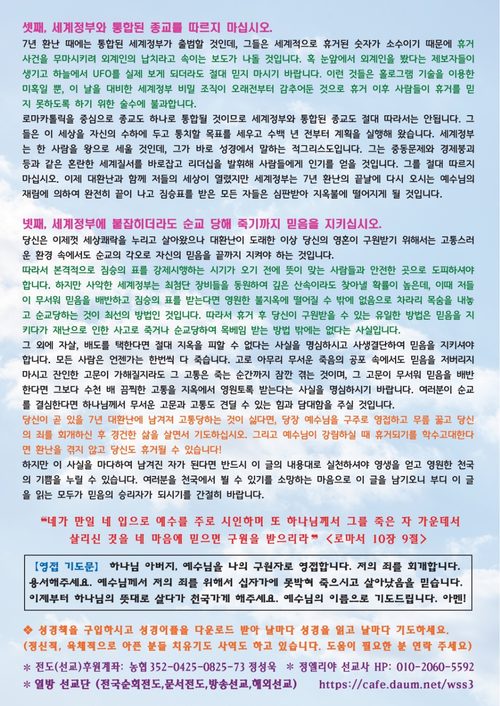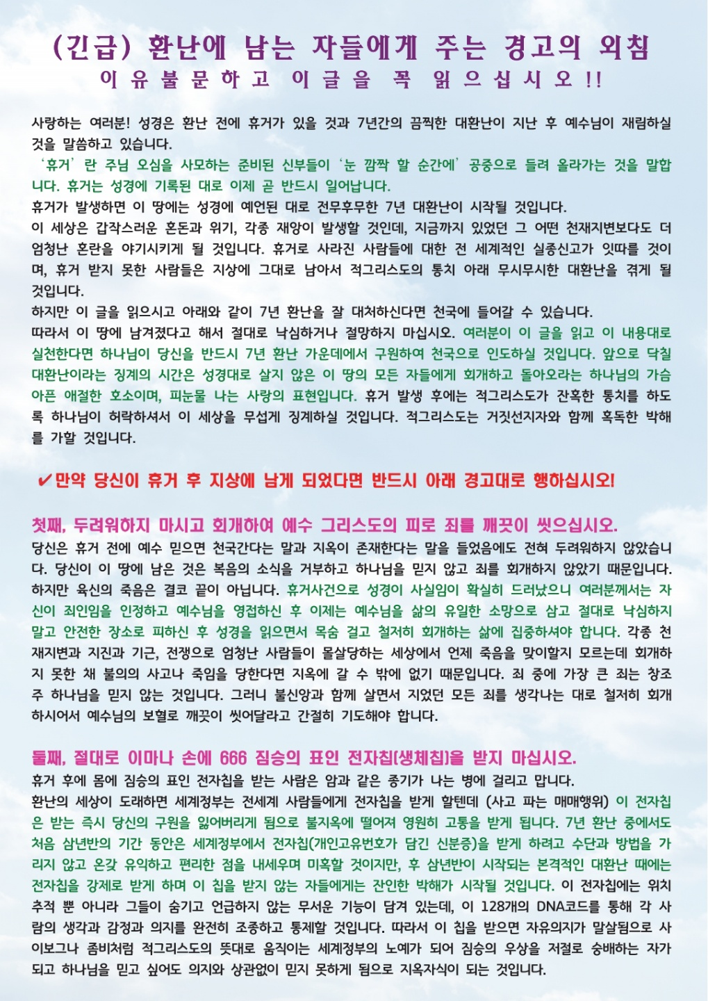 아울러 아래 전도지가 필요하신 분들은 저에게 연락 주시면 인쇄한 전도지를 보내드리도록 하겠습니다.