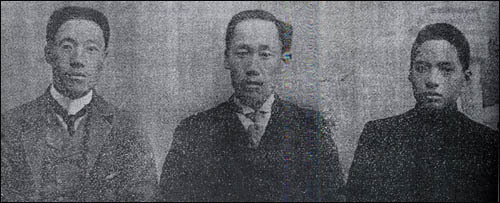 안중근 의사와 의거준비를 하면서 의거 3일전인 1909년 10월 23일 중국인 사진관에서 기념촬영. 좌로부터 안중근,우덕순,유동하