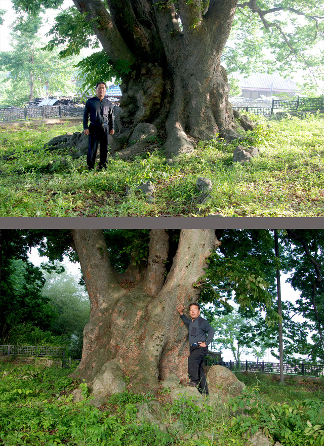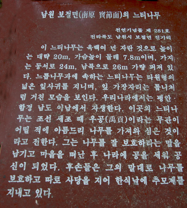 마을 기슭에는 수령 600년 정도의 오래된 느티나무가 넓은 큰가지를 거느리고 서 있다.