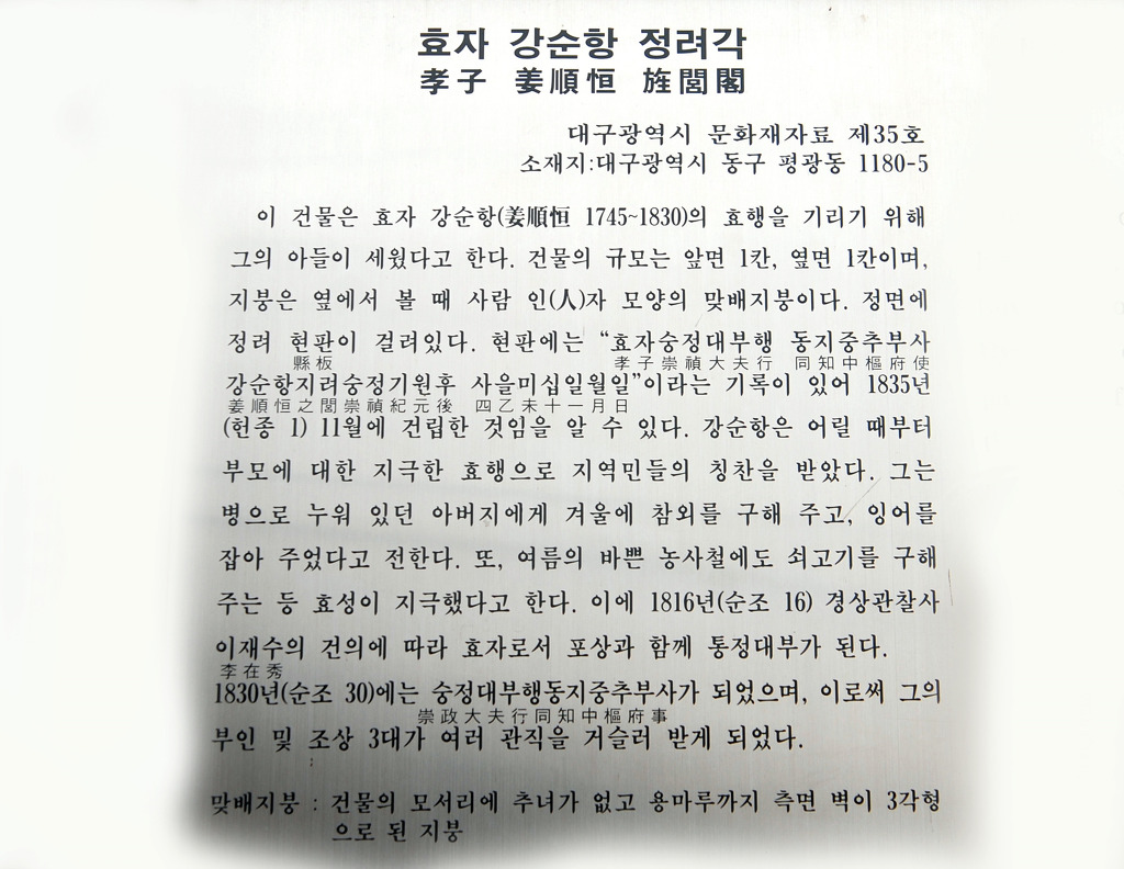 평광동 마을 입구에 세워진 효자였던 강순항 정려각