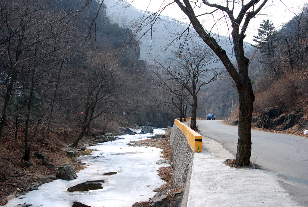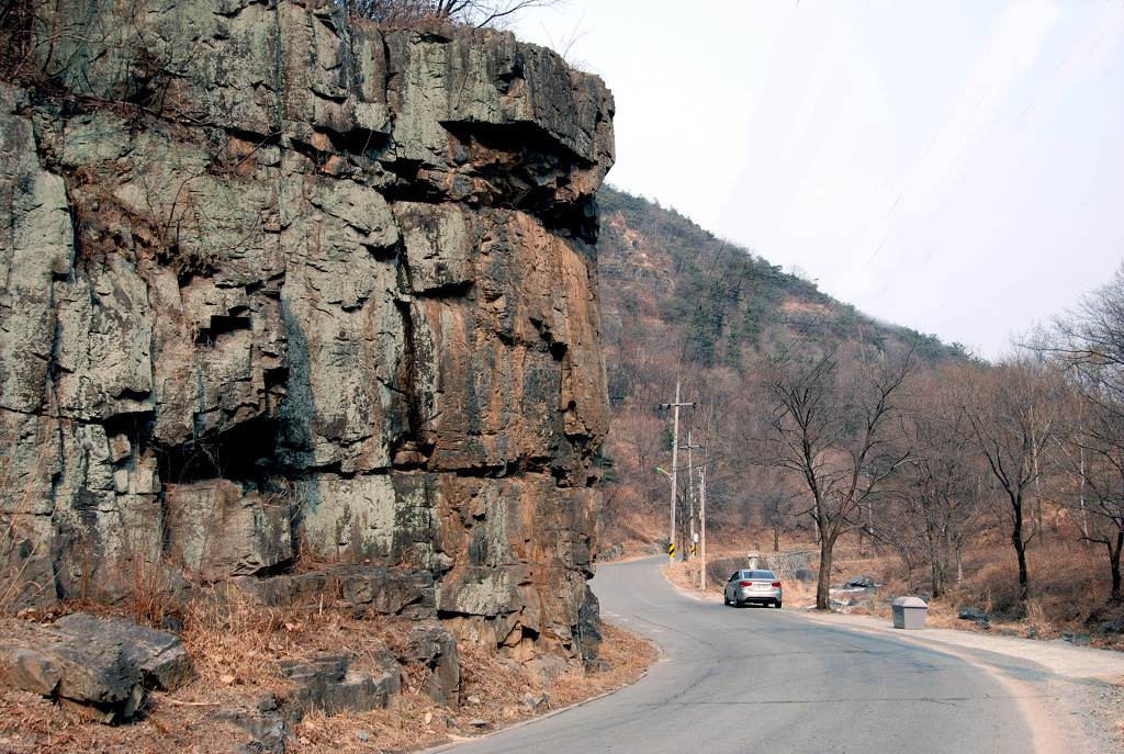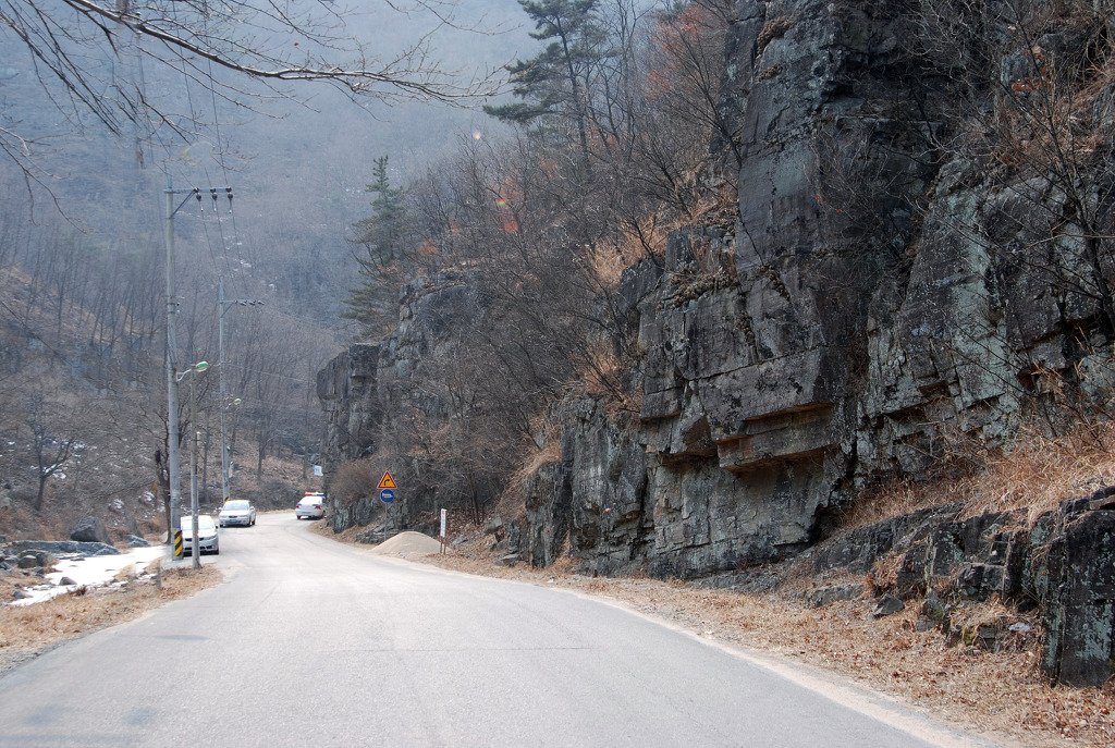 좁은 협곡과 높은 절벽바위도 보이는 평광동으로 가는 도로길