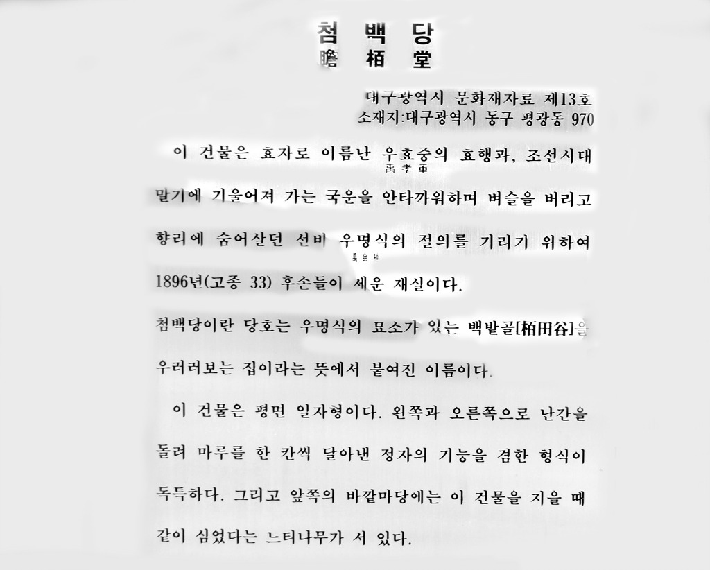 오랜역사를 알수 있는 평광동 첨백당 재실은 대구시 문화재로 지정 관리되고 있다.