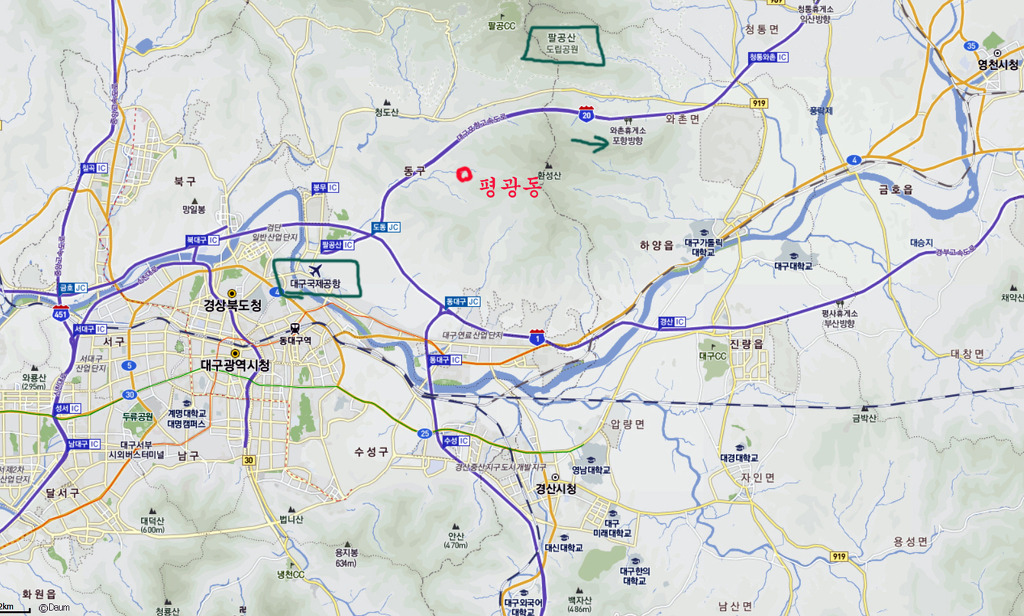 평광동은 대구공항을 벗어나는 불로동에서 깊숙히 들어간다.