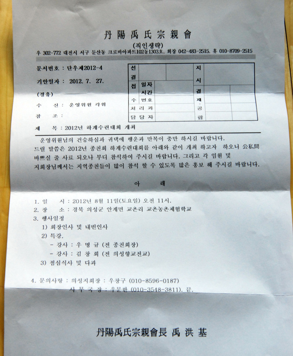 많은 종인으로 구성된 문희공파 하계수련회 있음을 안내장을 보고 알게 되었다.