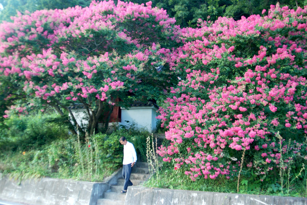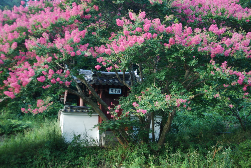 백일홍나무 군락으로 붉게 조화를 이룬 효자각