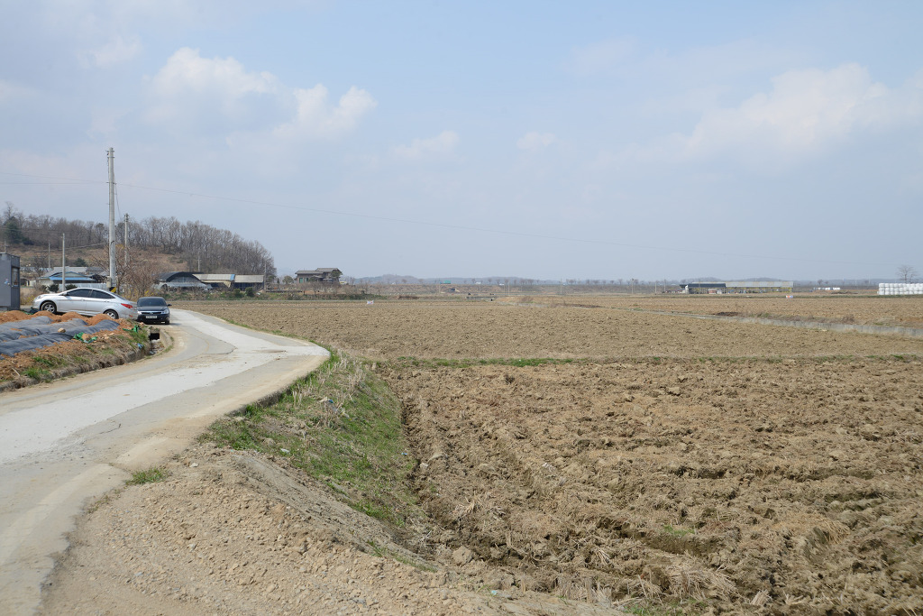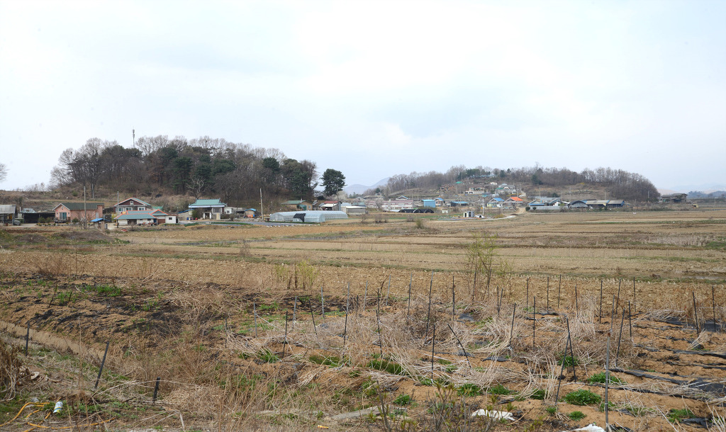 마을 앞 넓은 농토 너머로 임진각으로 가는 자유로가 보인다.