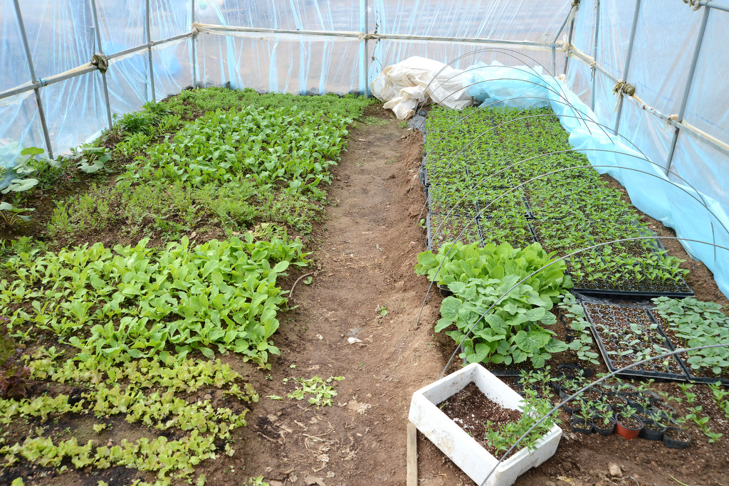 집 옆 비닐하우스 안에 다양한 채소들이 자라고 있다.