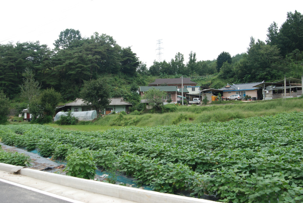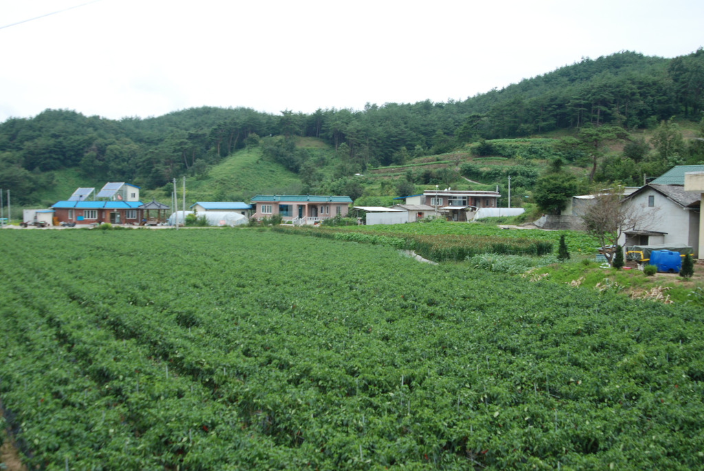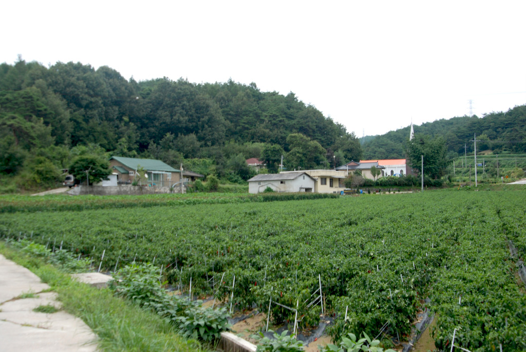 아랫 반송에 고추밭 아래에 마을회관이 보인다.