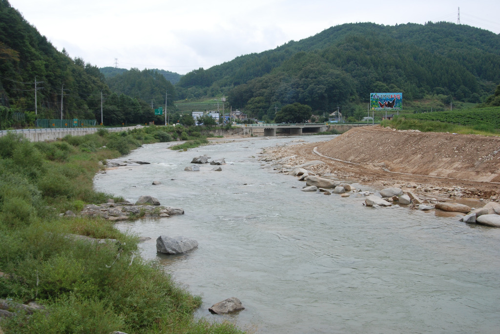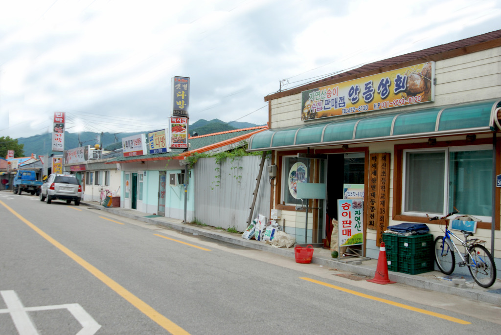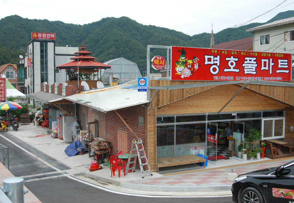 산골 하천 지형 중심에 위치한 봉화군 호명면 면중심 상가들