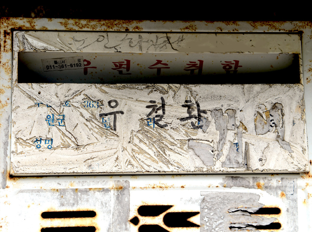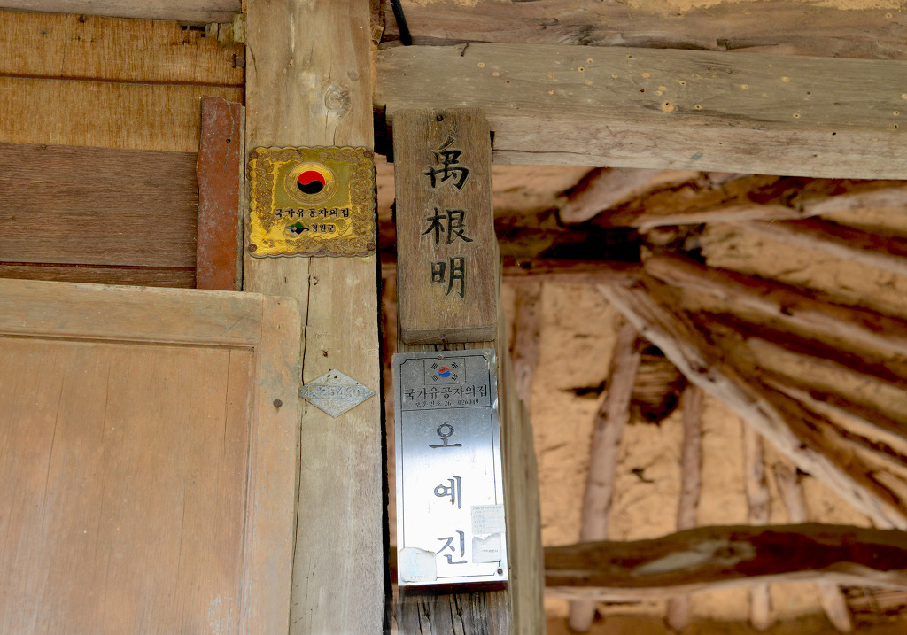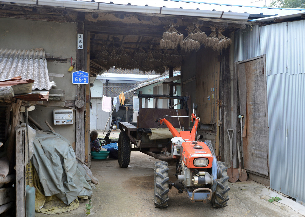 집성촌 마을에 문패가 붙어 있는 농가 대문간과 경운기