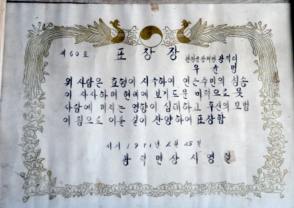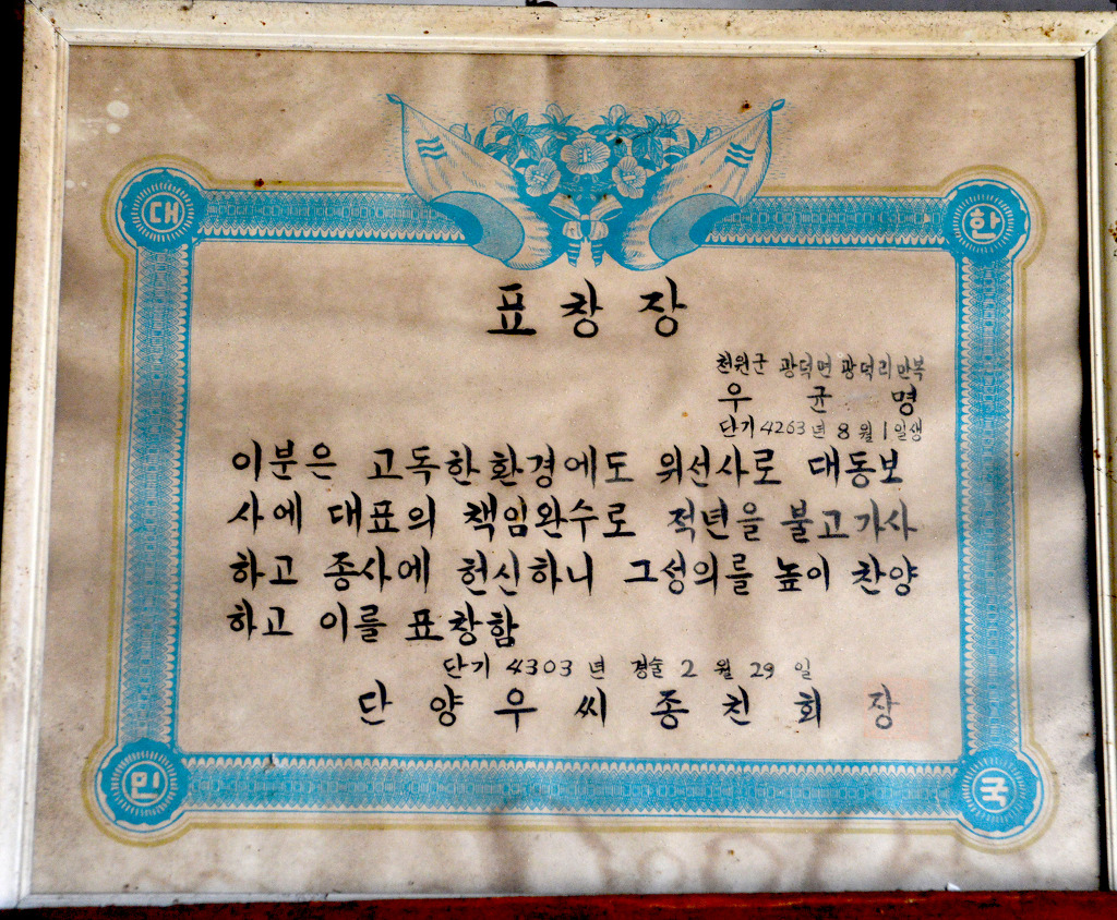 단양우씨 대동보 족보 발간에 공헌하신 노력의 표창장 1970