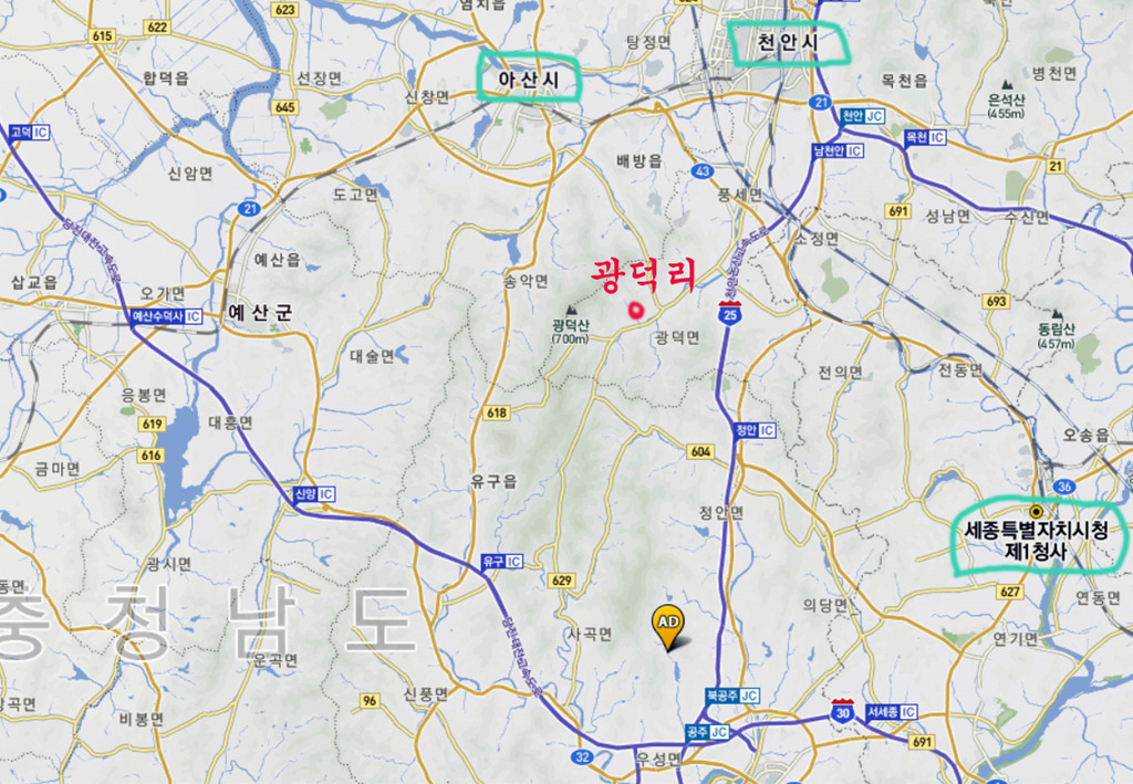광덕산 광덕사 아래에 위치한 광덕리 집성촌 위치