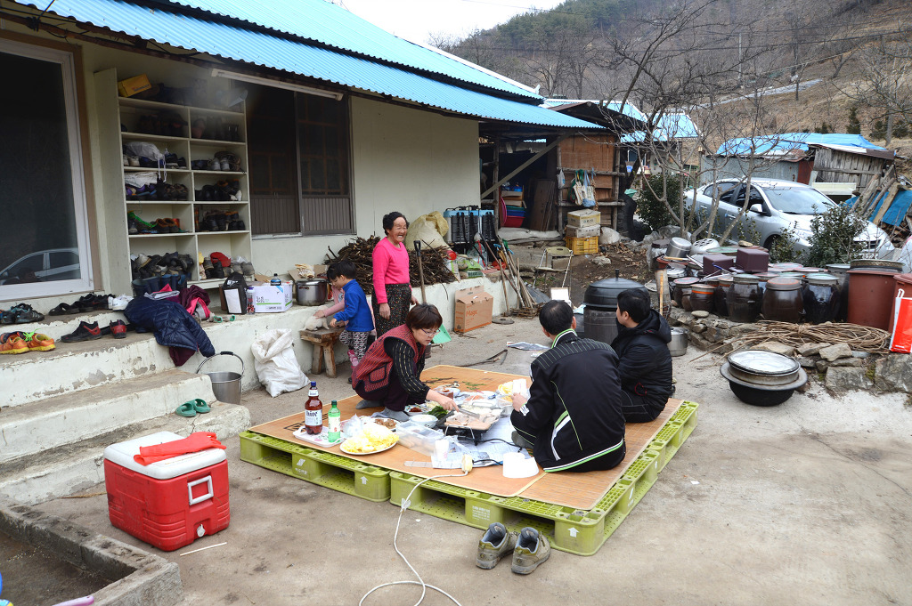 재실을 찾아가다 명절을 맞아 가족들과 마당에서 점심식사를 하는 가정에 잠시 들렀다.