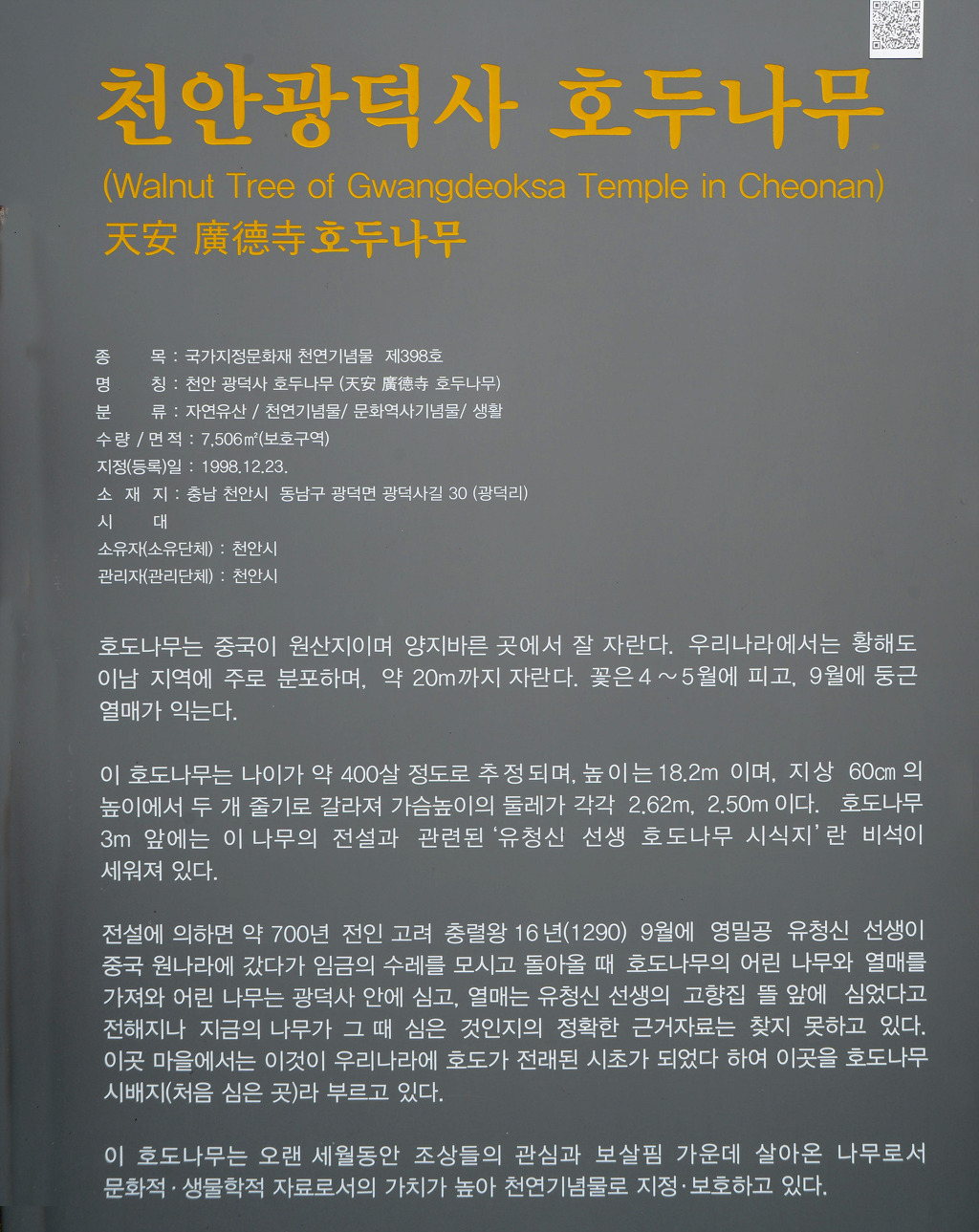 광덕사 사찰내에는 천년기념물 호두나무가 사찰과 함께 유명하다는 사실을 방문하면서