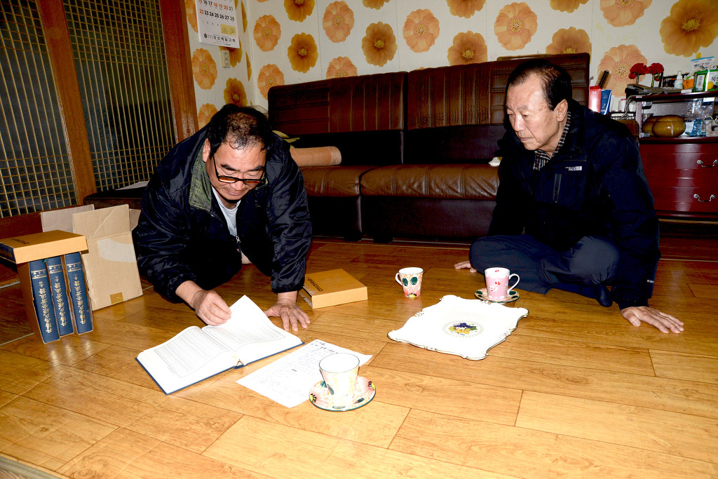 마서면 당선리 집성촌 직계 족보 기록을 살펴보고 있다.